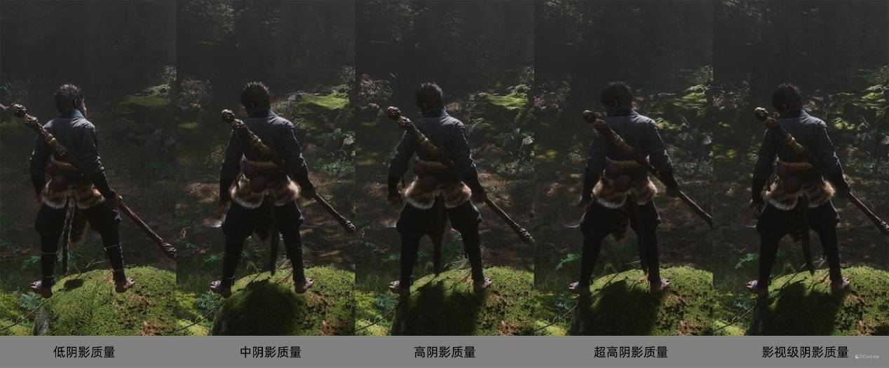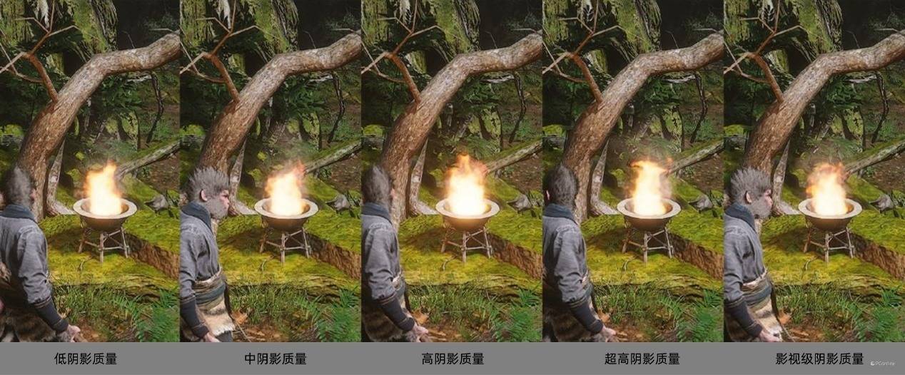第2个比较影响帧数的设置是阴影质量,从下面的对比图可以看到,当该选项调节为“低”时,物品阴影几乎完全消失。而阴影质量“中”和阴影质量“高”的视觉效果相差大,“高”档位比“中”更清晰。当阴影质量调整至“超高”后,画面阴影细节会丰富许多。当然,如果你的显卡性能足够强,那开影视级的阴影质量,你将获得超真实的阴影效果,实际效果就好像下面的图一样,天命人的裙摆的各种细节都能很好的倒映在石头上,画面也更锐利一些。