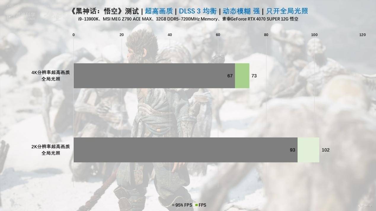 4K分辨率其实索泰GeForce RTX 4070 SUPER 12GB 悟空显卡也能战,实测仅用DLSS 2的话,这张显卡在大部分游戏里照样能够跑到60 FPS的及格线之上,除了小部分对显卡压力巨大的游戏(如:赛博朋克2077),不过也不用担心,这款显卡还有DLSS 3帧生成黑科技可以开,性能还能有提升。