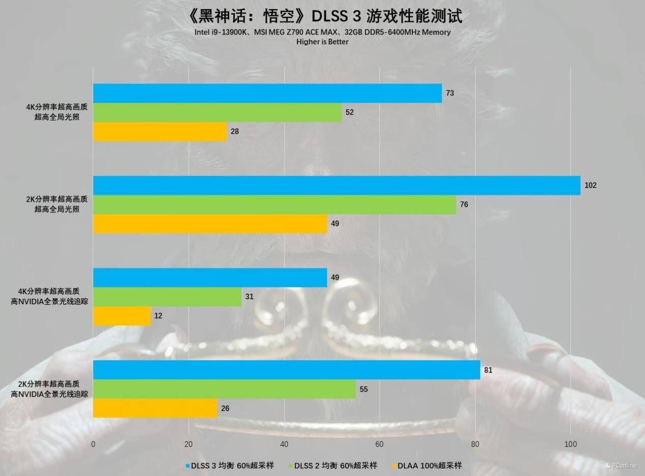 测试里我们还发现DLSS 3帧生成效果惊人。我们用索泰GeForce RTX 4070 SUPER 12GB悟空在2K与4K分辨率下,分别测试了DLSS 2均衡档、DLSS 3均衡档以及原生分辨率的表现。