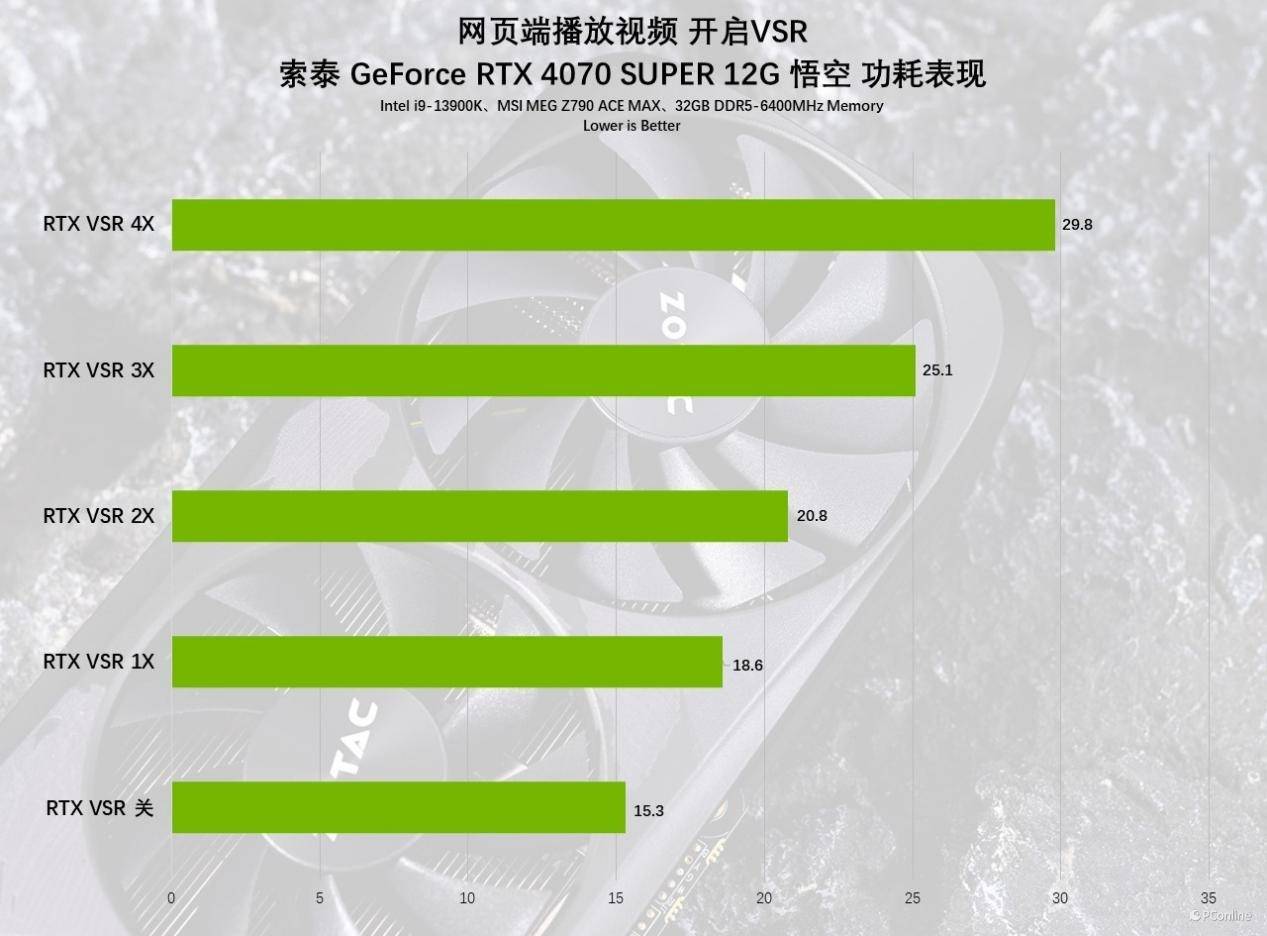 有用户可能担心功耗的问题,我们这里有实测了一下,使用浏览器在线观看视频的情况下,开启VSR 4档,索泰GeForce RTX 4070 SUPER 12GB悟空的功耗仅有29W左右,如果你开启的是VSR 1档,那功耗更是不足20W,所以日常观看一些老番或者清晰度比较差的视频时,笔者还是推荐你开启VSR,真的会让画质有一个“质的提升“。