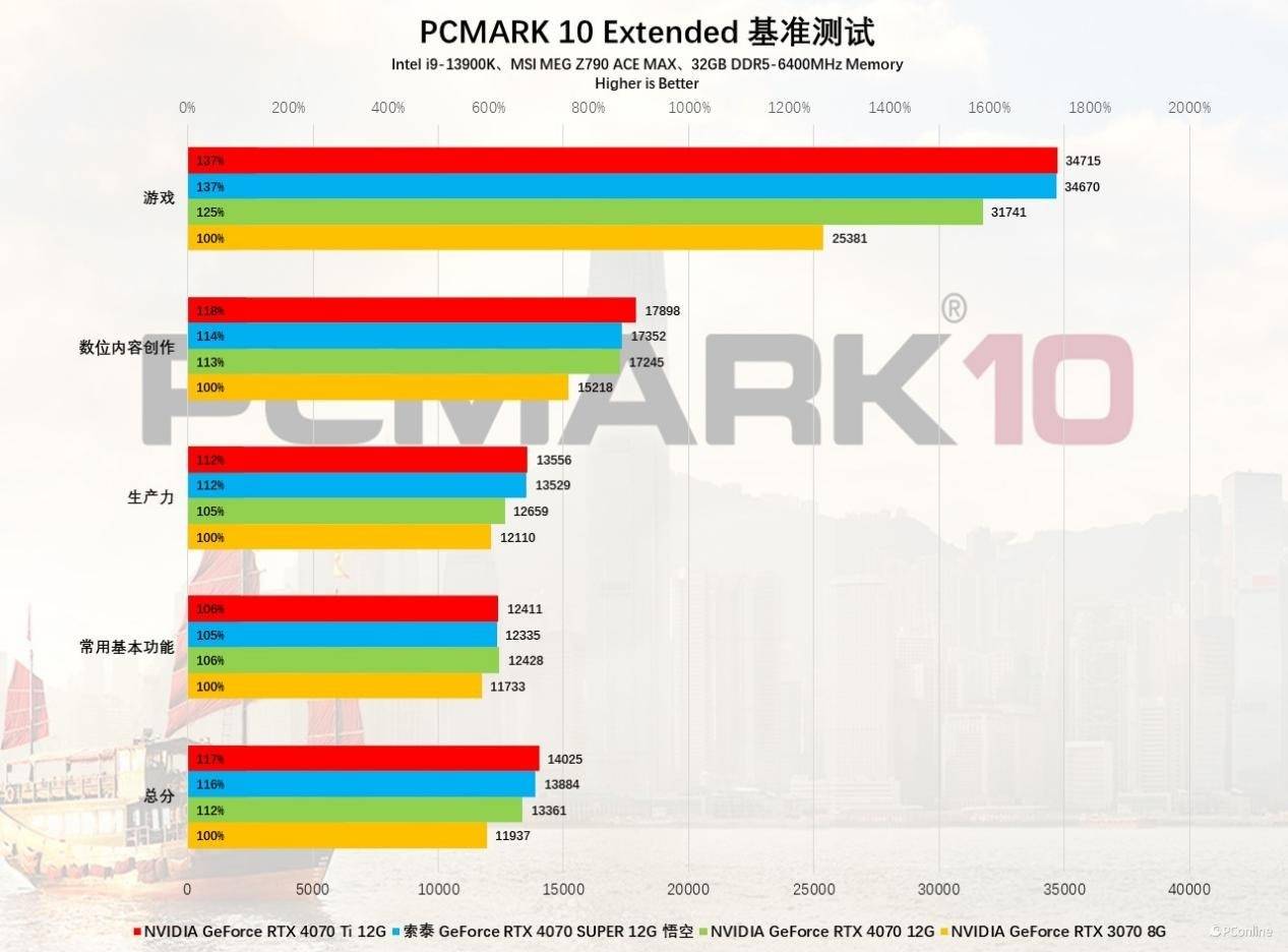 基础的办公生产力我们用UL Procyon进行测试,不过丝滑办公对这款显卡的压力都太小了,差距基本不太明显,不过索泰GeForce RTX 4070 SUPER 12GB悟空依旧比RTX 3070强8%以上。
