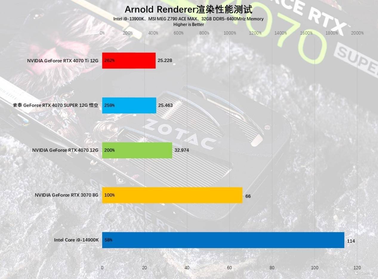 来个压力更大的Arnold渲染器,它是一个先进的蒙特卡洛光线追踪渲染器,主要用于电影和高端视觉效果制作。不过之前它比较依赖CPU渲染,即便新版本添加了GPU支持,但与某些专门的GPU渲染器相比,性能仍有提升空间。不过我们有索泰GeForce RTX 4070 SUPER 12GB悟空显卡,它的性能想到出色,在实测中基本与RTX 4070 Ti平起平坐,对比起前代显卡的话,性能更是暴涨150%!