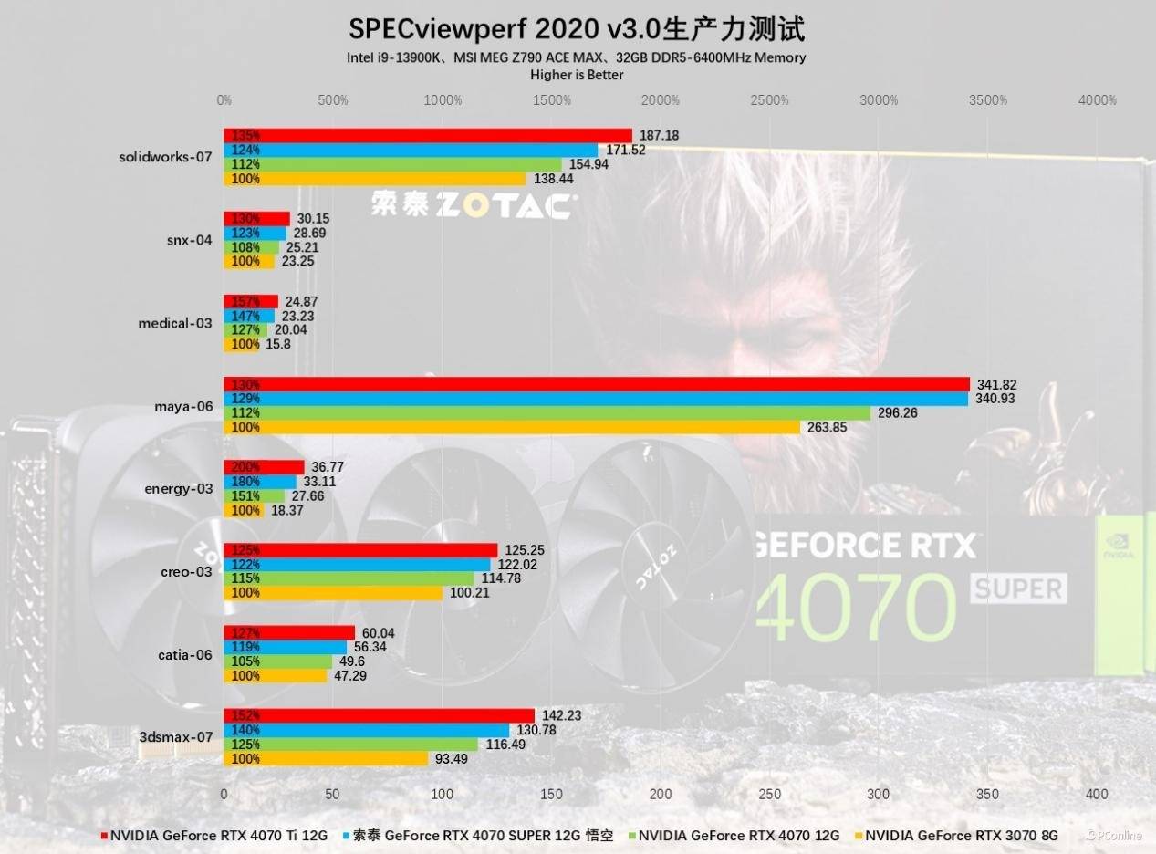 工业领域的提升也是惊喜连连,在SPEC 2020中,索泰GeForce RTX 4070 SUPER 12GB悟空的性能提升肉眼可见,平均都有30%左右的性能提升幅度。