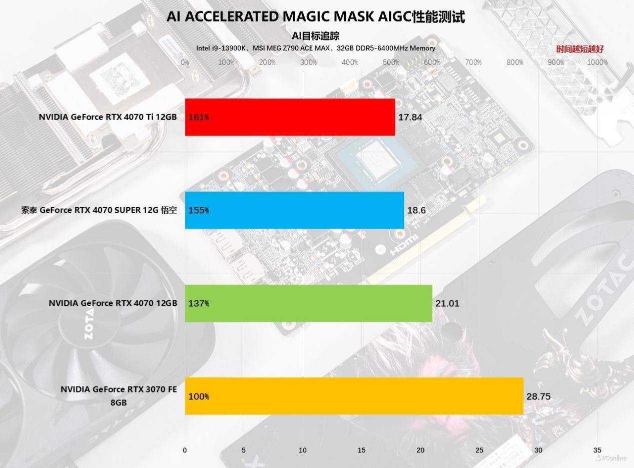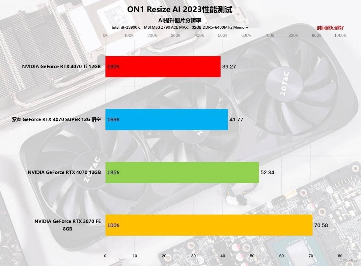 在另一款AI应用软件ON1 Resize AI 2023中,使用AI将5张图片提升200%分辨率,此时索泰GeForce RTX 4070 SUPER 12GB悟空的速度为平均8秒一张,而上代的RTX 3070为14秒,对比RTX 4070,则新显卡会快30%以上,如果对比RTX 4070 Ti话,二者已经不分伯仲了。