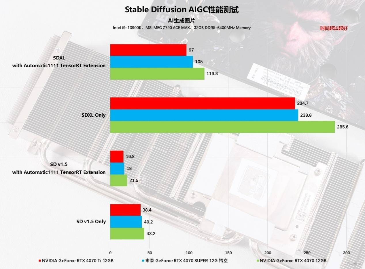实际结果来看,索泰GeForce RTX 4070 SUPER 12GB悟空的AI性能对比上代显卡肯定是遥遥领先,对比RTX 4070的话,性能也有10%的提升,基本已经跟RTX 4070 Ti在同一起跑线了。玩家作为入门使用的话,那这款显卡还是相当不错的,加上还有12G的大显存,这在AI领域已经有不小的优势了。