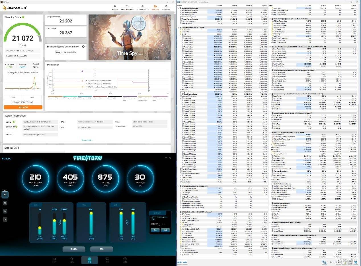将核心频率再加100MHz,此时索泰GeForce RTX 4070 SUPER 12GB悟空在Time Spy内的频率已经能够跑到2910MHz了,得分也进一步上探到了21202分。