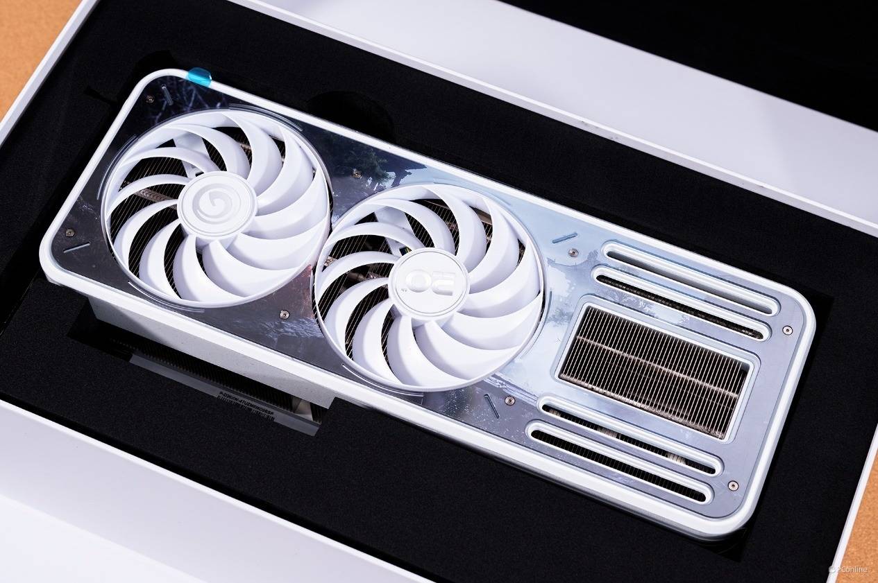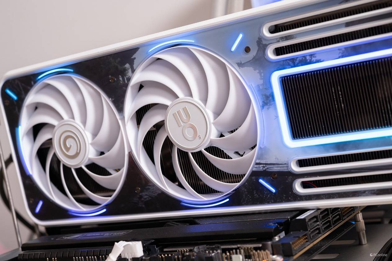 再说说正面的两把散热风扇,影驰将其称为“静霜风扇”,听名字就知道来头不小。每把风扇都是100mm,采用折角扇叶设计,实现高流速的进出风循环。并且还支持智能启停,高负载时能够全力输出,降低温度;低负载时也能安静自若,提供舒适使用环境。