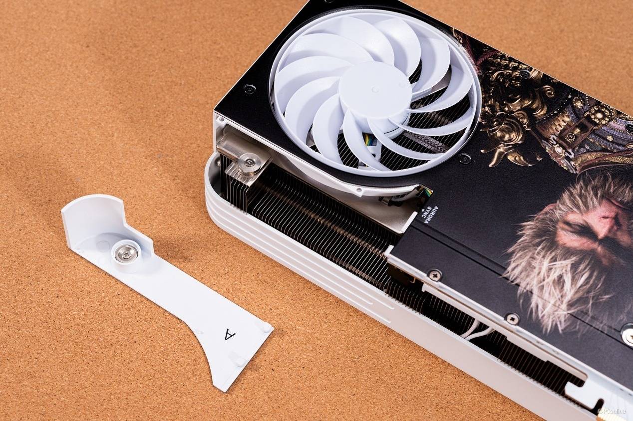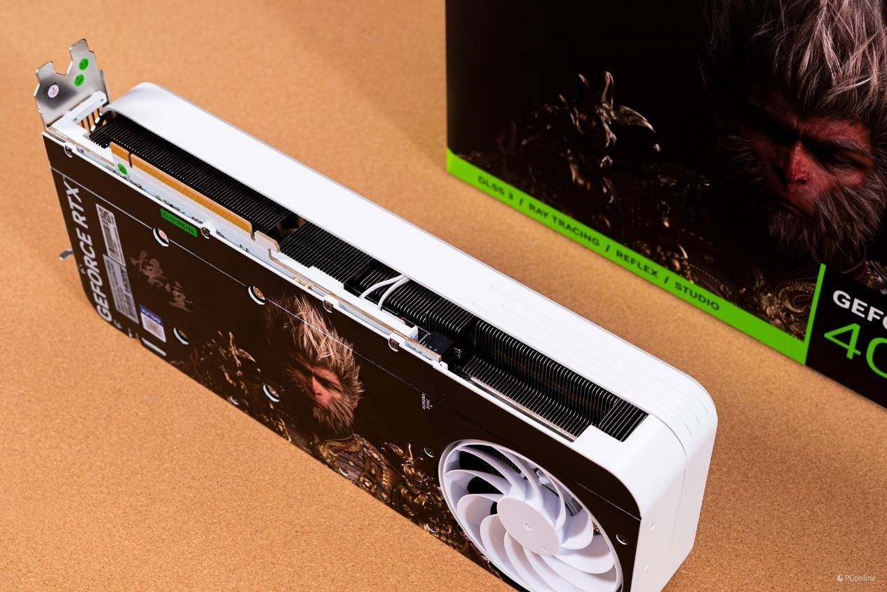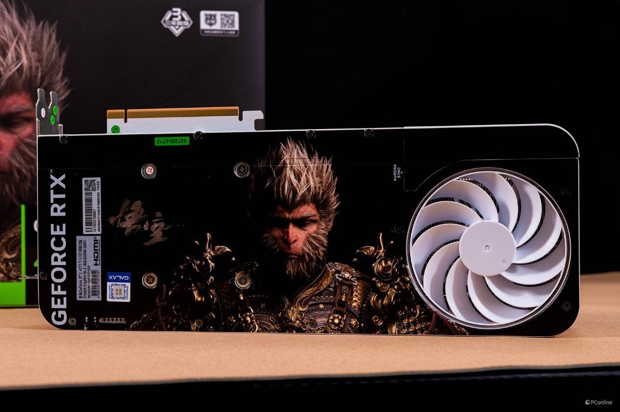 背面出彩的不仅仅是《黑神话:悟空》定制图案,还有这个独特的风扇设计,平时其他显卡都是背后开一个散热窗口,影驰则是直接把散热风扇装在背部,能够更高效的将热量排出卡外,与正面的风扇形成一个良好的循环。