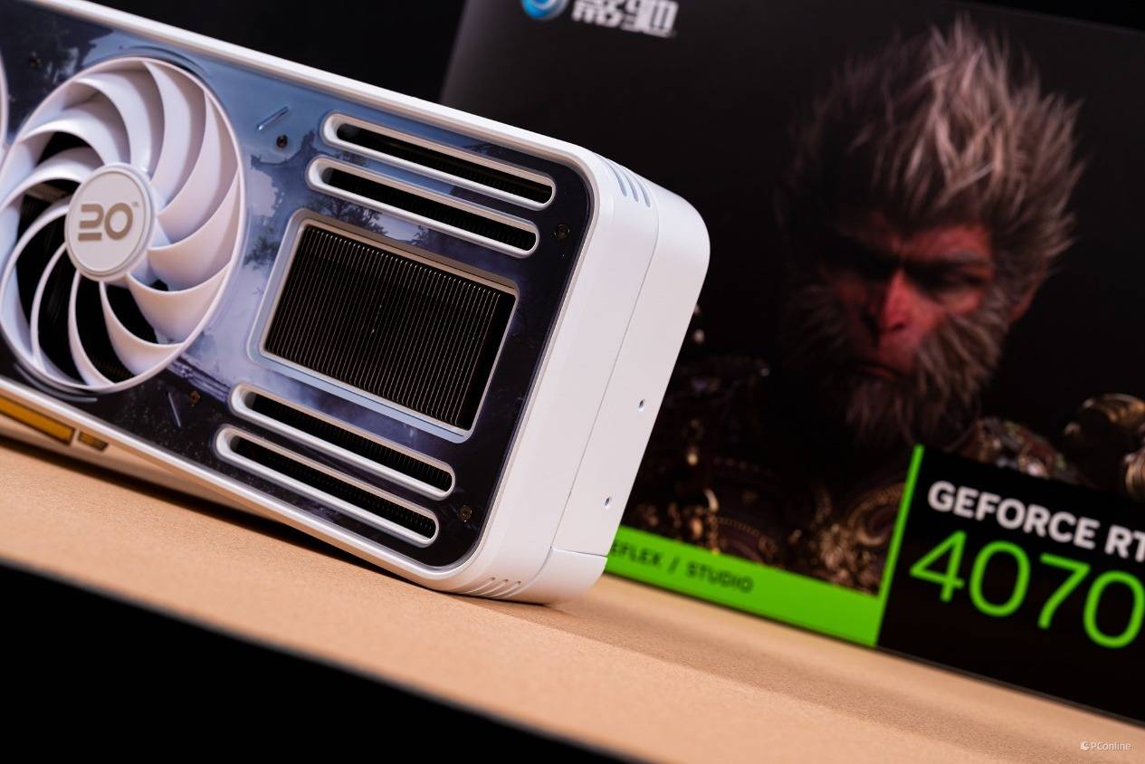 影驰GeForce RTX 4070 Ti SUPER特别纪念版显卡在外观方面延续了之前的设计,四周采用圆润倒角设计,不过正面的亚克力面板有所改动,换上了游戏内的风景,表面也加上了磨砂效果,所以不仅观感舒适,上手质感也是一绝。