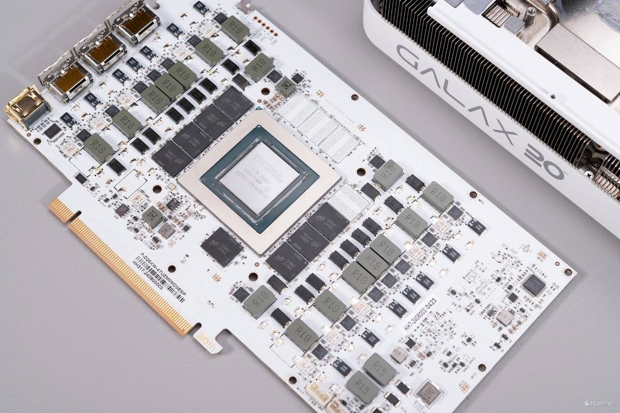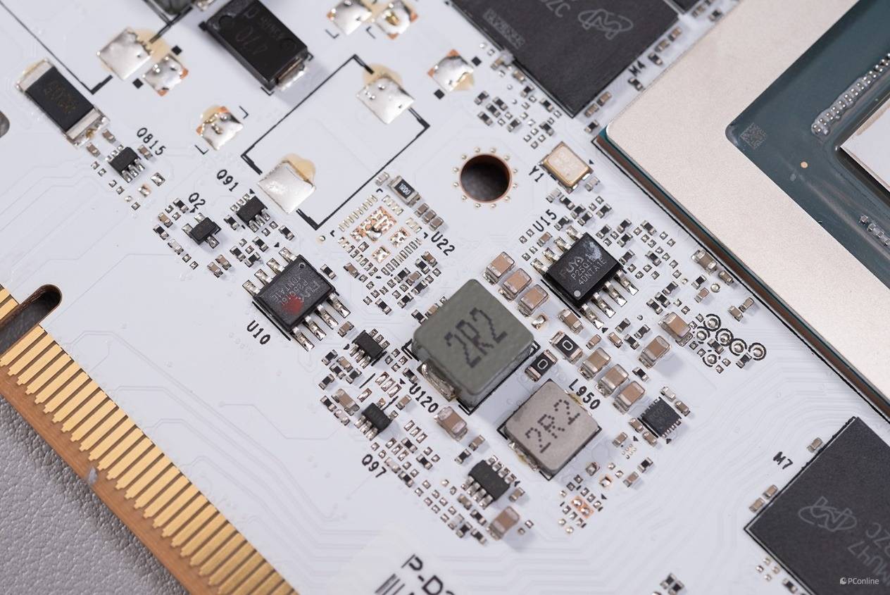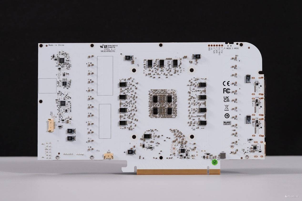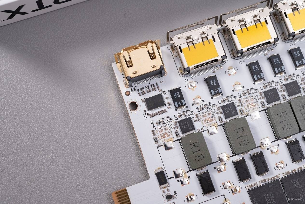 纯白的PCB一眼吸睛,并且PCB也不是我们平时看到那种四四方方的设计,圆润的设计不仅美观,制造工艺与成本也更高。另外,这款显卡还用到了 14层全新开发的高规格 PCB,电气性能更好。