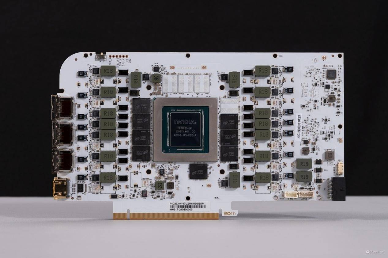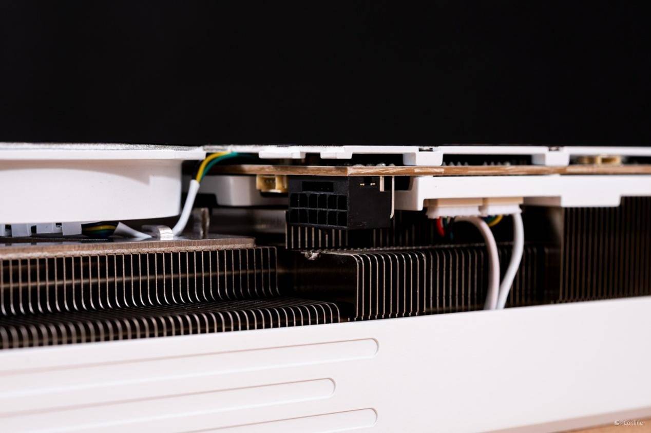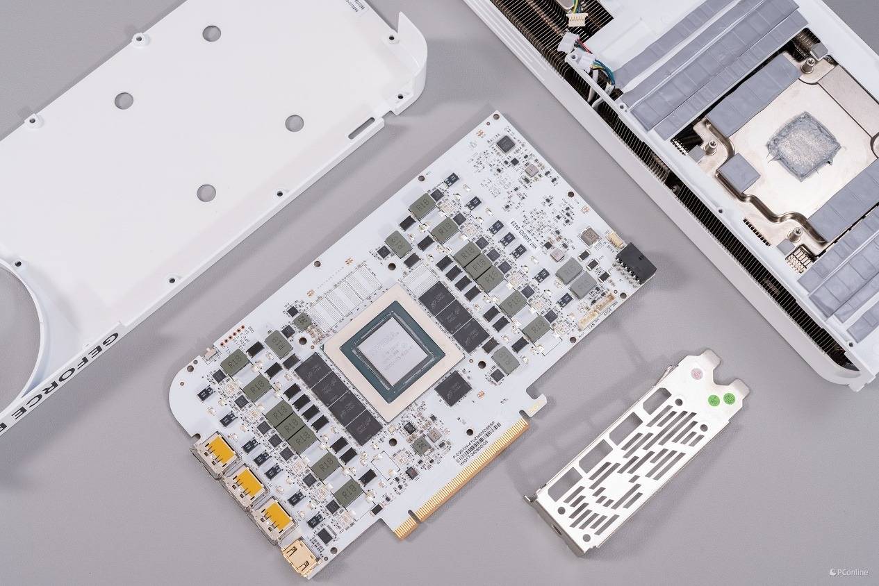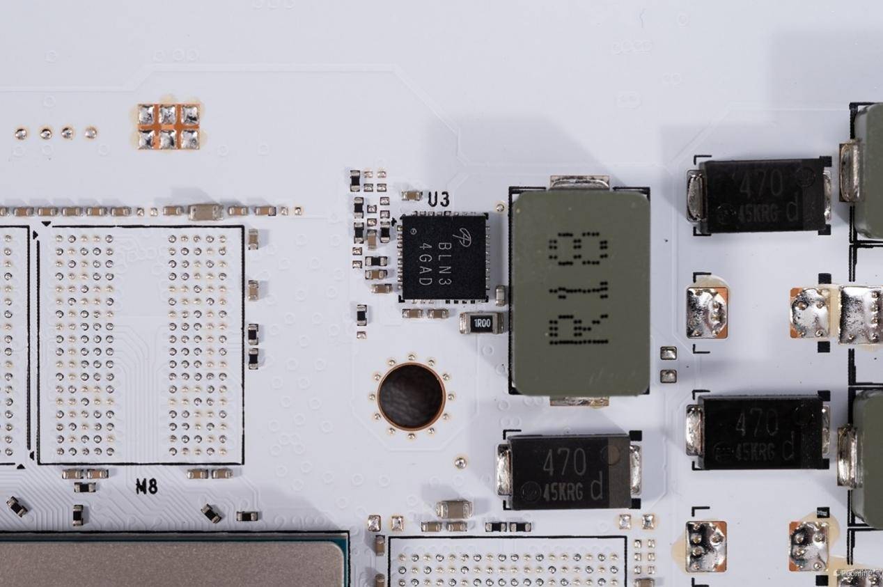 纯白的PCB一眼吸睛,并且PCB也不是我们平时看到那种四四方方的设计,圆润的设计不仅美观,制造工艺与成本也更高。另外,这款显卡还用到了 14层全新开发的高规格 PCB,电气性能更好。