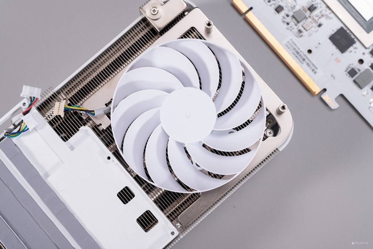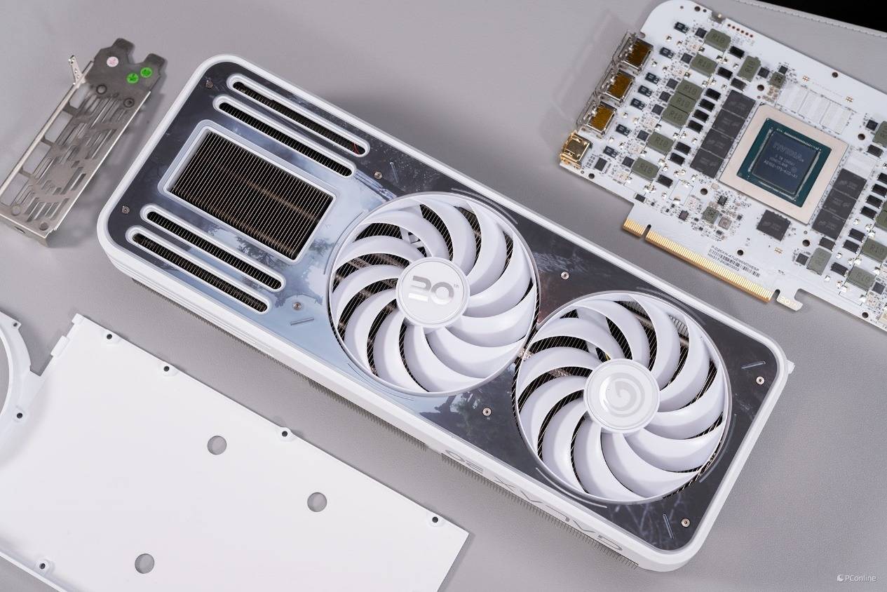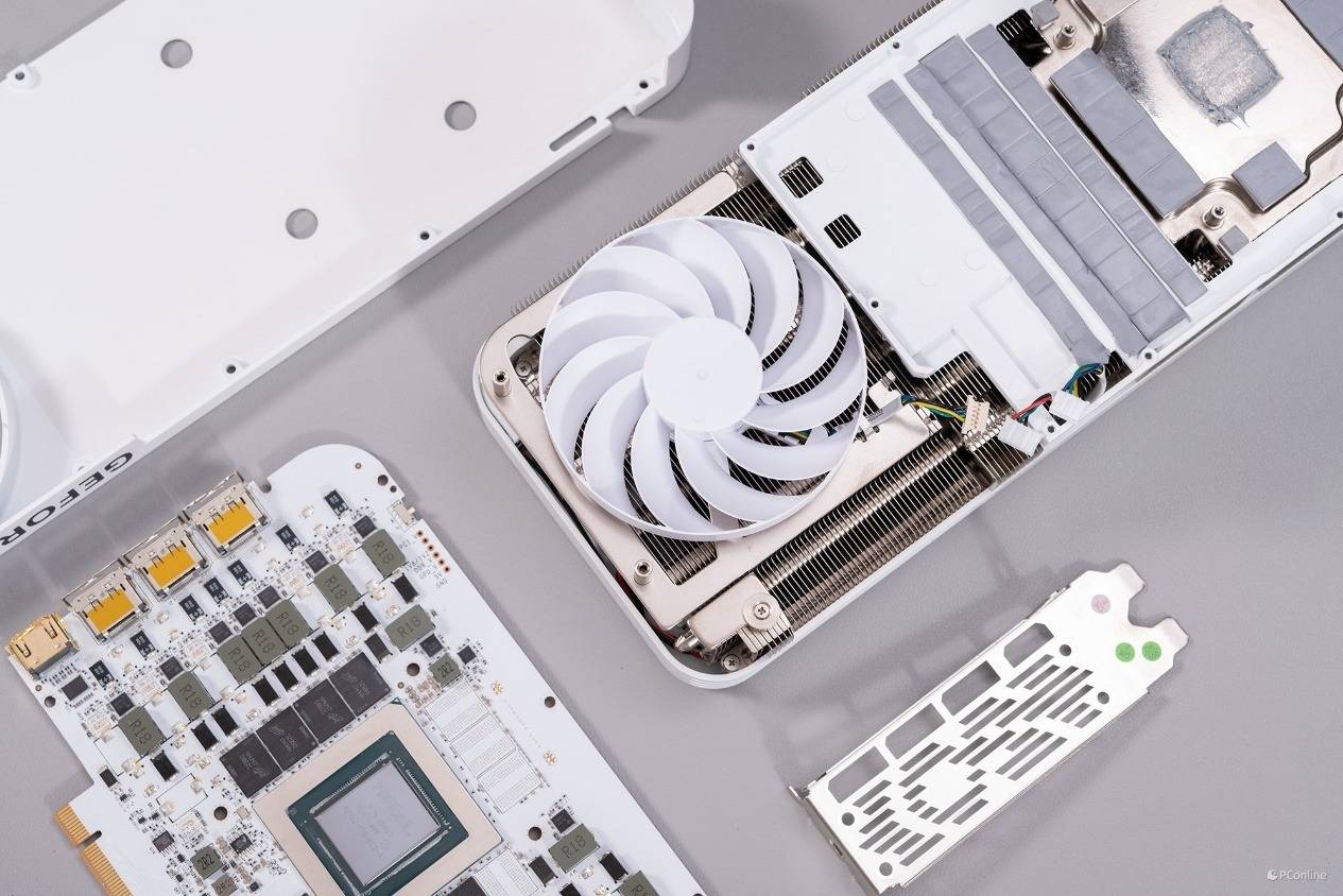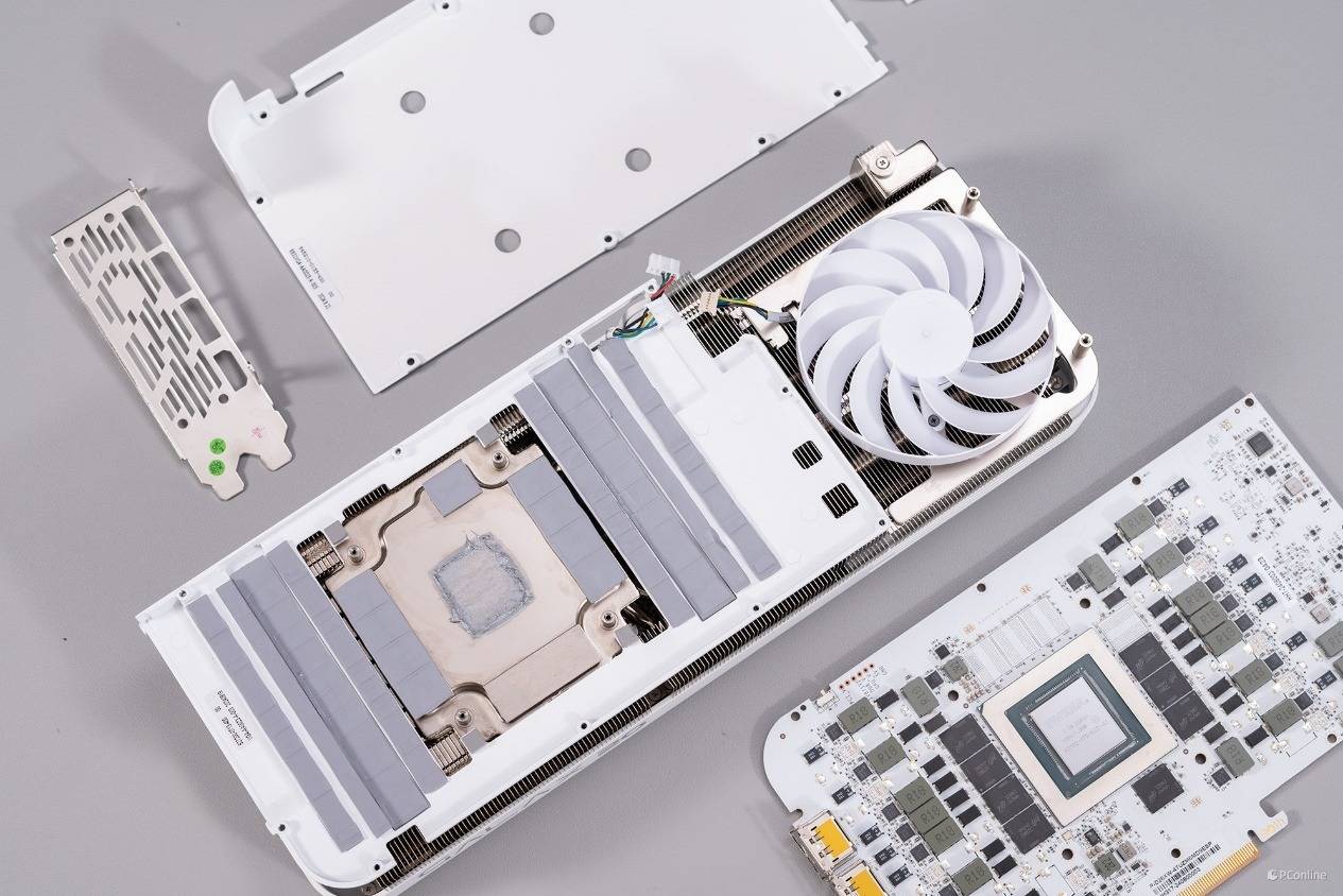 纯白的PCB一眼吸睛,并且PCB也不是我们平时看到那种四四方方的设计,圆润的设计不仅美观,制造工艺与成本也更高。另外,这款显卡还用到了 14层全新开发的高规格 PCB,电气性能更好。