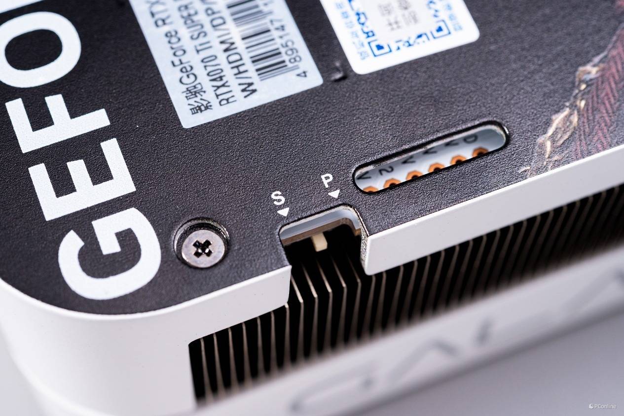 看完显卡一圈了,有玩家肯定会问,它的供电接口呢?影驰GeForce RTX 4070 Ti SUPER特别纪念版显卡用的是隐藏电源接口设计,只要把显卡边缘的金属盖取下,就能见到隐藏在内部的供电接口。