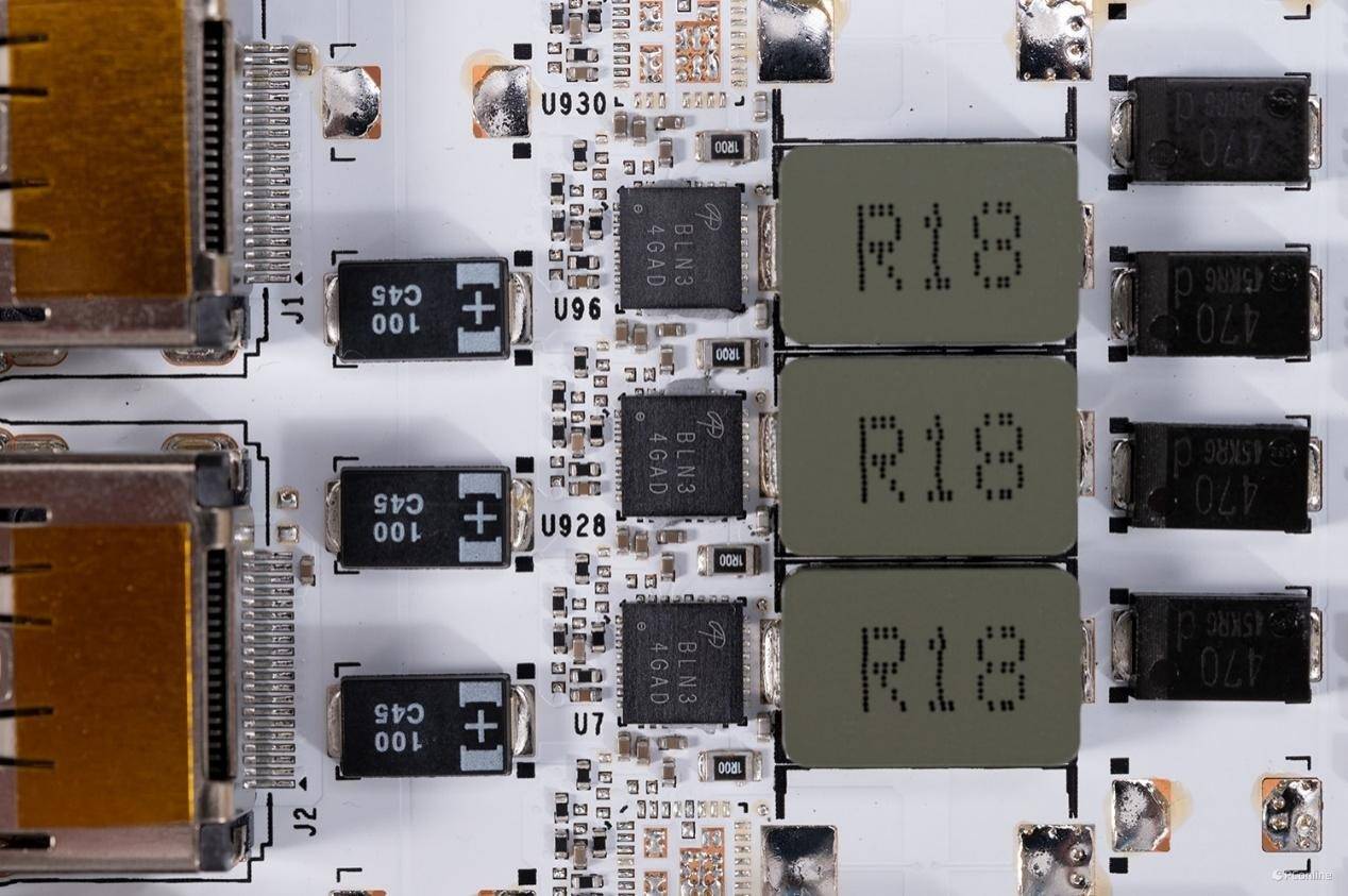 左下角HDMI 2.1接口则是镀金设计,并且在它的左侧还有一颗HMDI retimer,是谱瑞科技的PS8419。这颗芯片的作用是移除抖动,能够有效增强HDMI信号。
