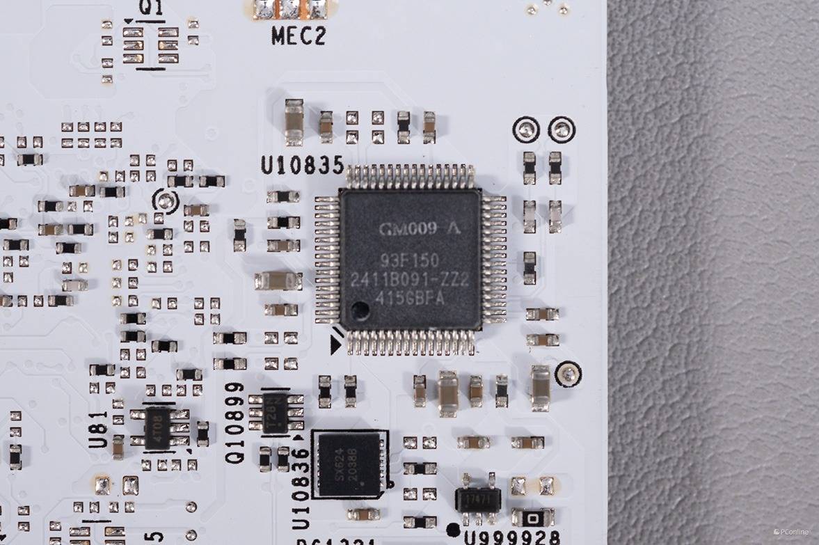 正面PCB的右上角还有一颗丝印为GM009-A 93F150的芯片,其作用是控制灯光,整张显卡的RGB效果就仰仗它了。