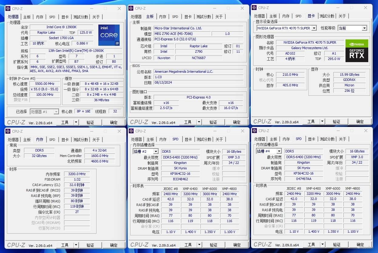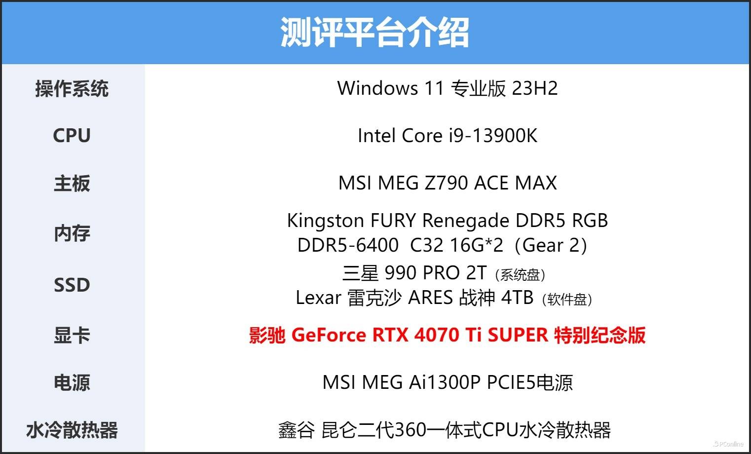 为了充分发挥显卡的潜力,在本次测试中我们选择的是旗舰级的 Core i9-13900K作为配套处理器。同时搭配了MSI MEG Z790 ACE,并使用了两条速度为6400Hz的金士顿Fury DDR5 16GB,整体配置如下,届时顶级硬件装备,只为确保这张显卡能够释放全部性能。