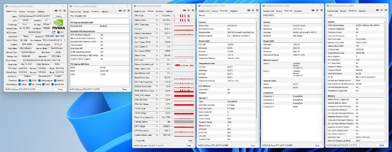 GPU-Z中则能够查看这张显卡更多的信息,例如影驰GeForce RTX 4070 Ti SUPER特别纪念版显卡的Boost频率为2670MHz,比MSRP版本高了60MHz。除此之外,TDP也多了10W,给到了295W,并且功耗最大可以提升至366W,给极客玩家预留了不小的超频空间。