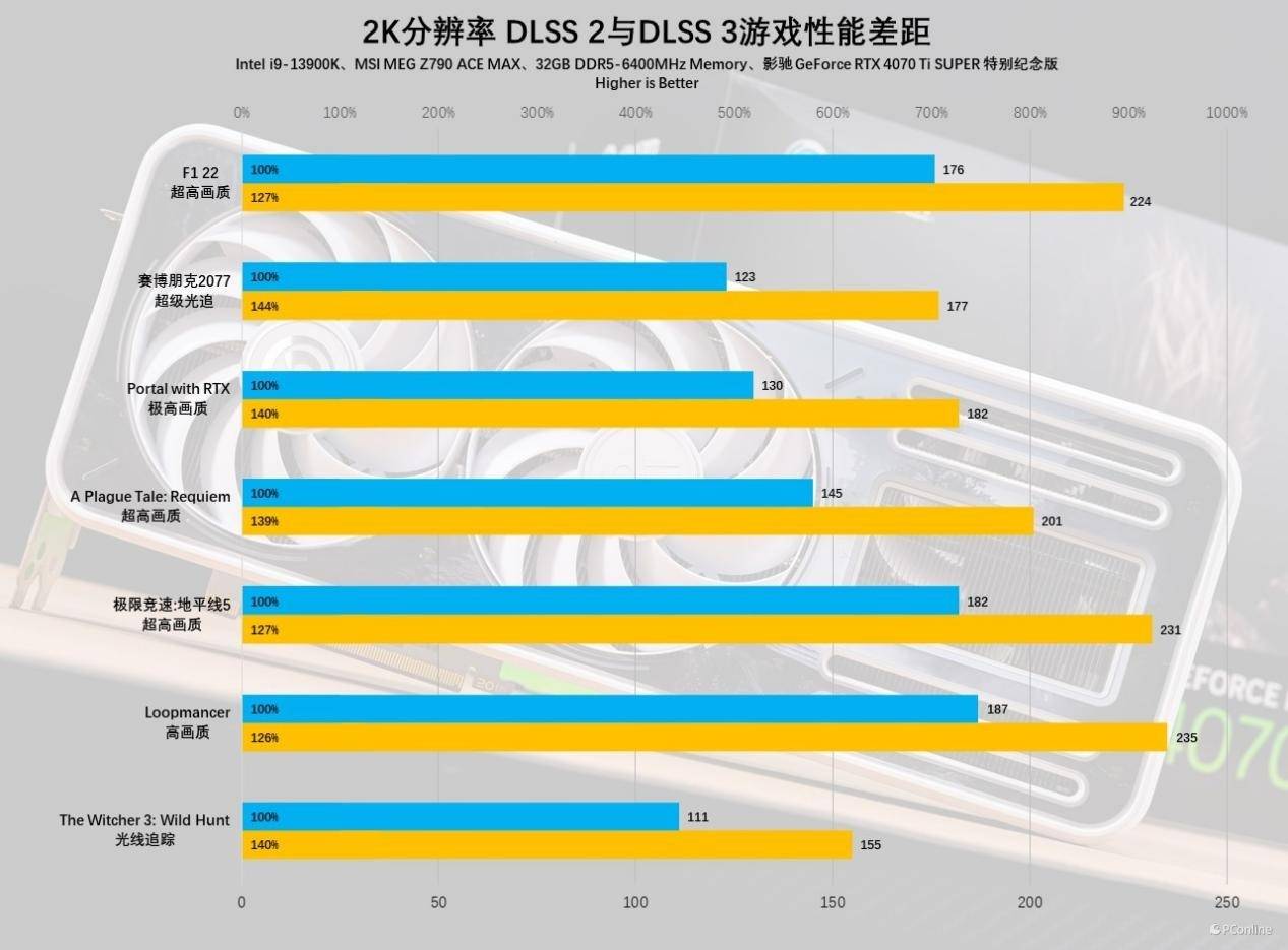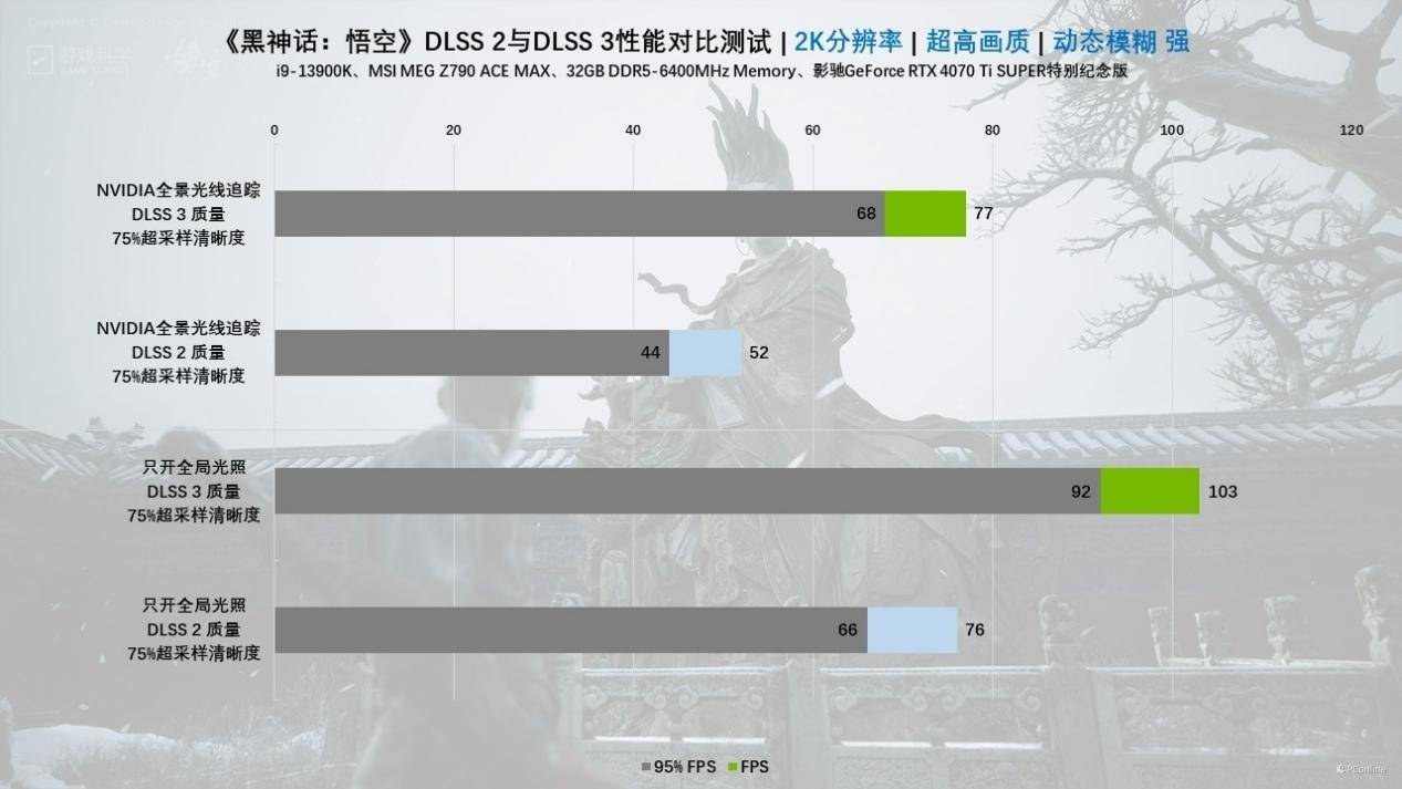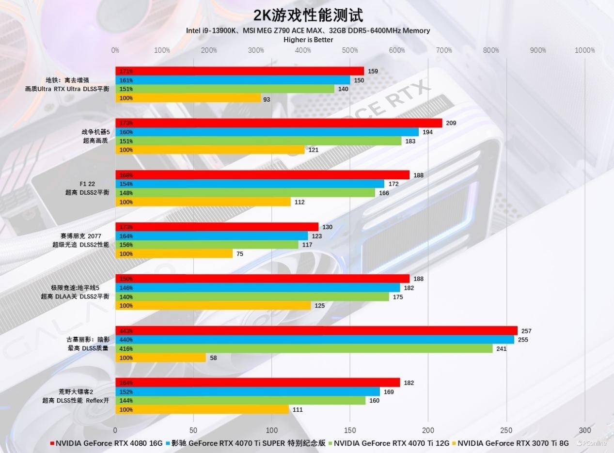 游戏应该是不少玩家关注的重点,考虑到影驰GeForce RTX 4070 Ti SUPER特别纪念版显卡的定位已经可以触摸到4K游戏的门槛了,因此这次游戏测试我们也是主要针对2K与4K两种分辨率。实测2K分辨率下,影驰GeForce RTX 4070 Ti SUPER特别纪念版显卡仅靠DLSS 2就有不错的表现了,不少游戏在2K下都是高刷级别的游戏体验。