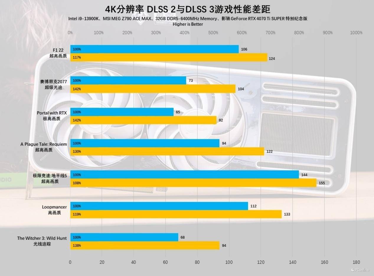 4K才是这张显卡的主战场,原本DLSS 2下60 FPS运行的3A大作,摇身一变在DLSS 3的加持下能够直接高刷体验,不得不说还是相当强势的。这就是换装更强核心与更大显存的魅力,要知道在以前,想要4K游戏,那都得是80级甚至90级才敢想的,现在有DLSS 3搭配影驰GeForce RTX 4070 Ti SUPER特别纪念版显卡就能轻松实现。