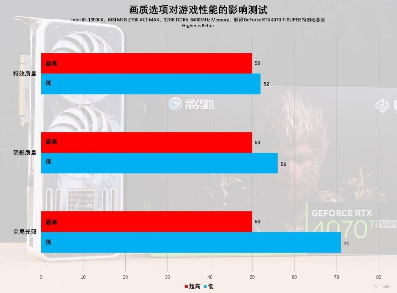在这十项参数里,有3个选项对游戏帧数有着显著影响,实测数据如下,我们都是用影驰GeForce RTX 4070 Ti SUPER特别纪念版显卡进行测试,为了看出不同设置明显的区别,我们只在2K画质下测试影视级画质与低画质两档,按照影响程度排名如下1.全局光照 2.阴影质量 3.特效质量。至于其他画质选项,经过实测,由于它们对系统帧数的影响较小,同时开启超高选项确实能为整体画面效果增色不少,并且帧数也几乎没有变化。