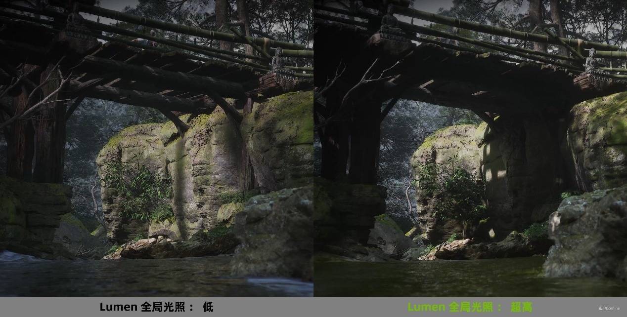 全局光照主要影响游戏画面的光线氛围,一共有五档可选,我们这里直接截取了低档位与超高档位的画面,可以看到在全局光照超高设置的加持下,画面确实精致了很多,已经有种光追的效果了。下图中,左侧在低预设下,岩壁上缺失了很多阴影,而超高预设下阴影能够很好的体现出来,甚至光线穿过桥面形成的光斑也能清晰呈现。