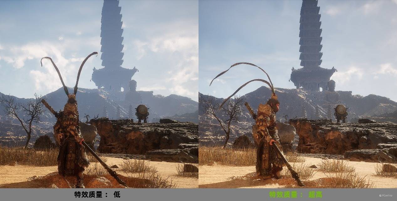 最后一个对帧数影响较大的参数就是特效质量了,光听名字你应该也能知道这个参数的作用。这项设置会明显影响游戏中的氛围感,例如开到超高甚至影视级时,画面不单止更清晰一些,同时观感上也会显得更有身临其境的感觉。同样的场景下,右侧远处的塔楼在观感上明显要优于左侧。