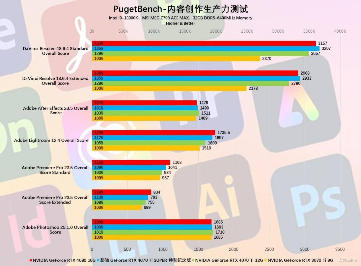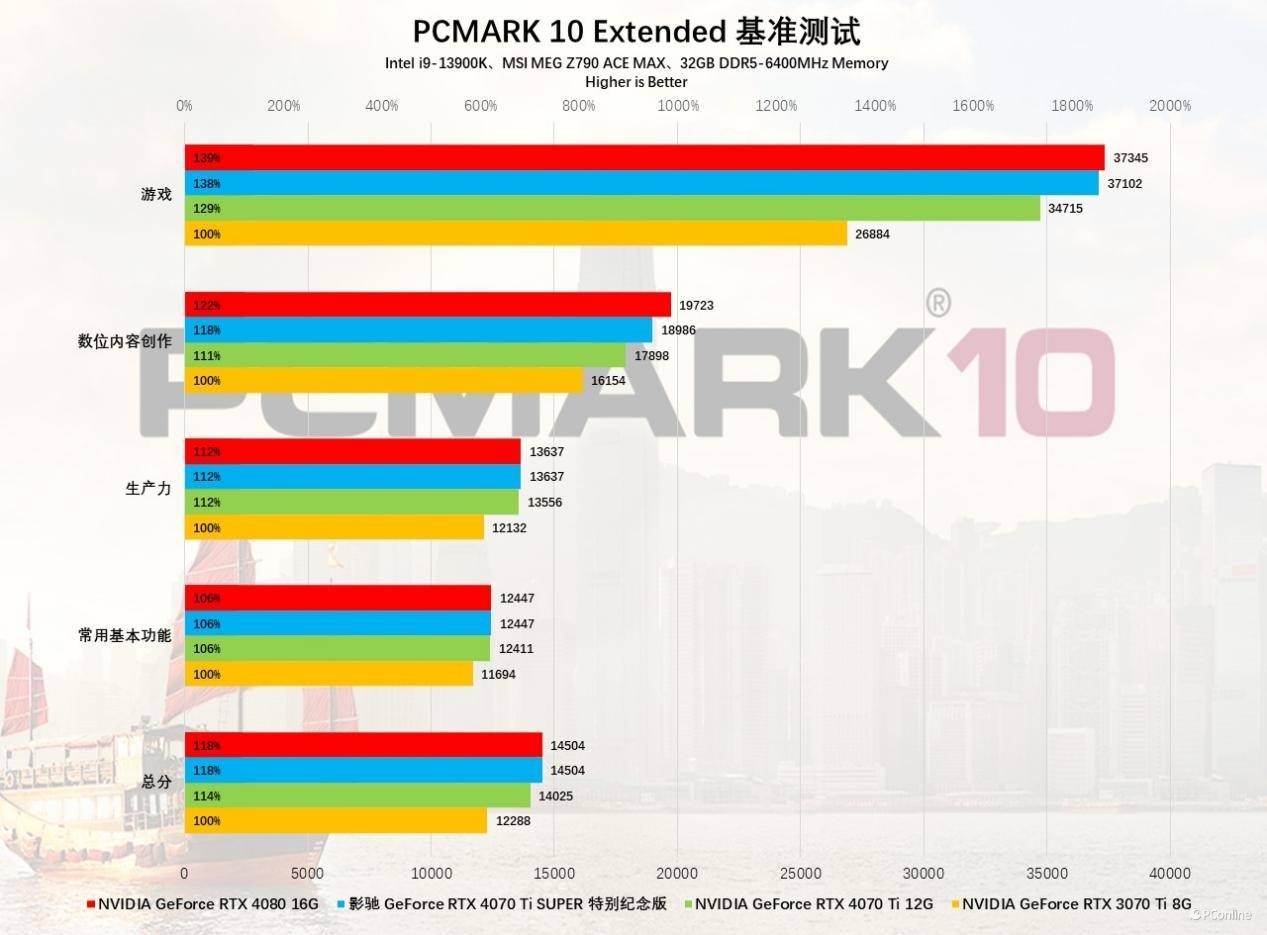创作性能我们将分成多个类型进行测试,首先还是基本的PCMark 10 Extended测试,影驰GeForce RTX 4070 Ti SUPER特别纪念版显卡在游戏性能、数位内容创作等方面都展现出了显著的提升。特别是游戏领域,对比前代显卡,提升幅度高达38%,想必大家在刚刚的游戏性能测试部分也深有体会。