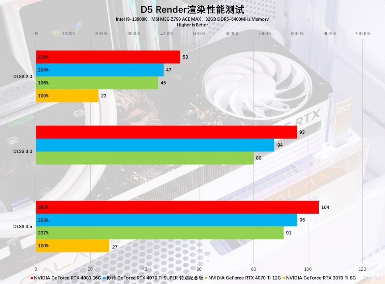 再看看另一款渲染软件D5 Render,它是一款基于DXR和光线追踪技术构建的GPU渲染器。它的一大特色就是支持了游戏里才会有的DLSS 3甚至是DLSS 3.5技术。创作者将享受更流畅的编辑体验,进而实现直观的交互式3D创建。实测影驰GeForce RTX 4070 Ti SUPER特别纪念版显卡启用 DLSS 帧生成和光线重建后,视窗中的FPS提高了2倍,能够在大型场景中提供令人惊叹的分辨率和视觉质量。