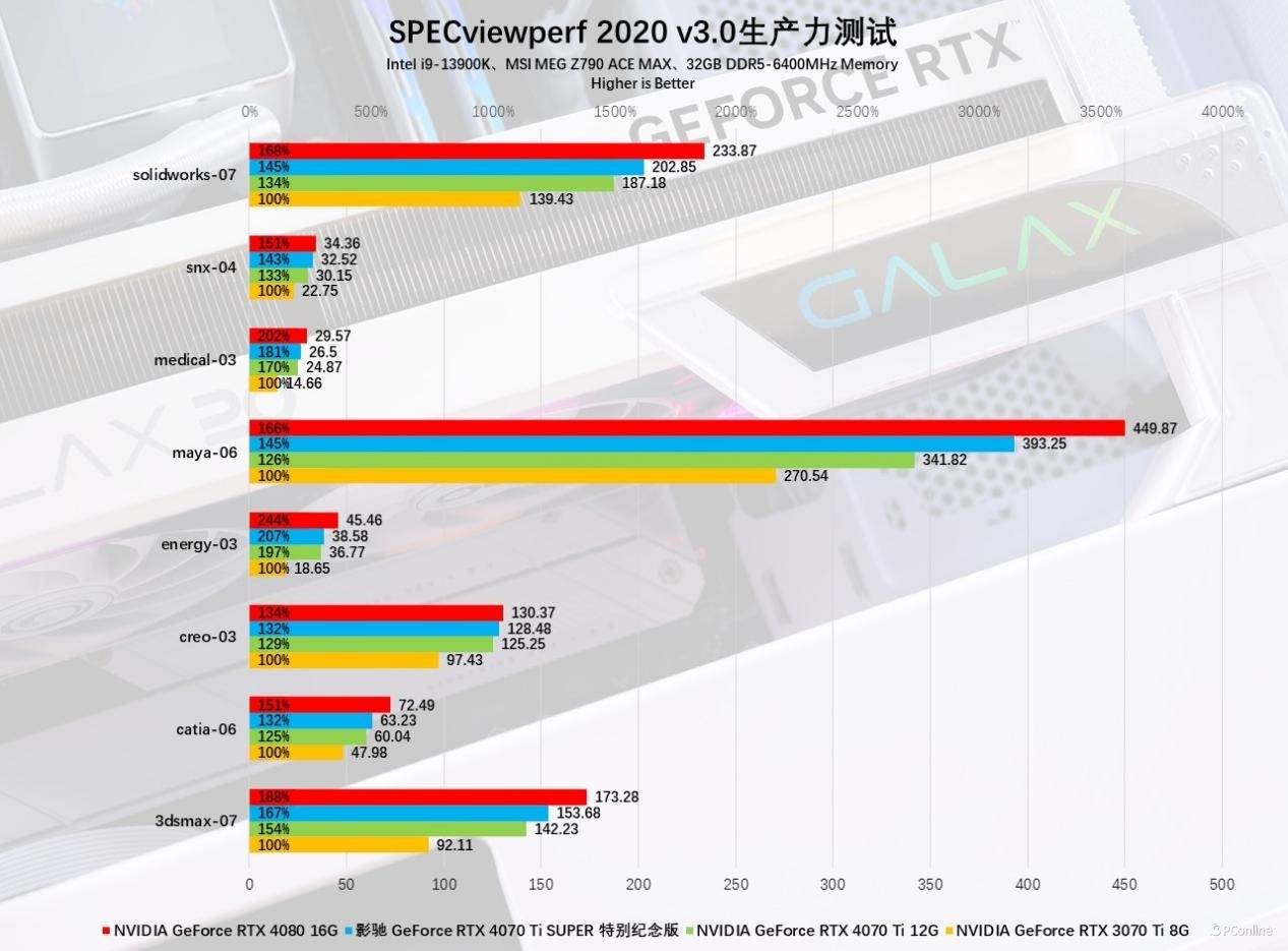 工业领域里,影驰GeForce RTX 4070 Ti SUPER特别纪念版显卡的表现也不弱,这里直接上SPEC 2020的测试结果,看图就知道了,新显卡的表现一骑绝尘,相比前代显卡,平均提升了40%以上的性能,可谓遥遥领先。