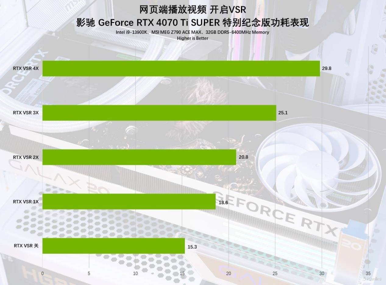 有用户可能担心功耗的问题,我们这里有实测了一下,使用浏览器在线观看视频的情况下,开启视频超分辨率(VSR) 4档,影驰GeForce RTX 4070 Ti SUPER特别纪念版显卡的功耗仅有29W左右,如果你开启的是视频超分辨率(VSR) 1档,那功耗更是不足20W,所以日常观看一些老番或者清晰度比较差的视频时,笔者还是推荐你开启视频超分辨率(VSR),真的会让画质有一个“质的提升“。