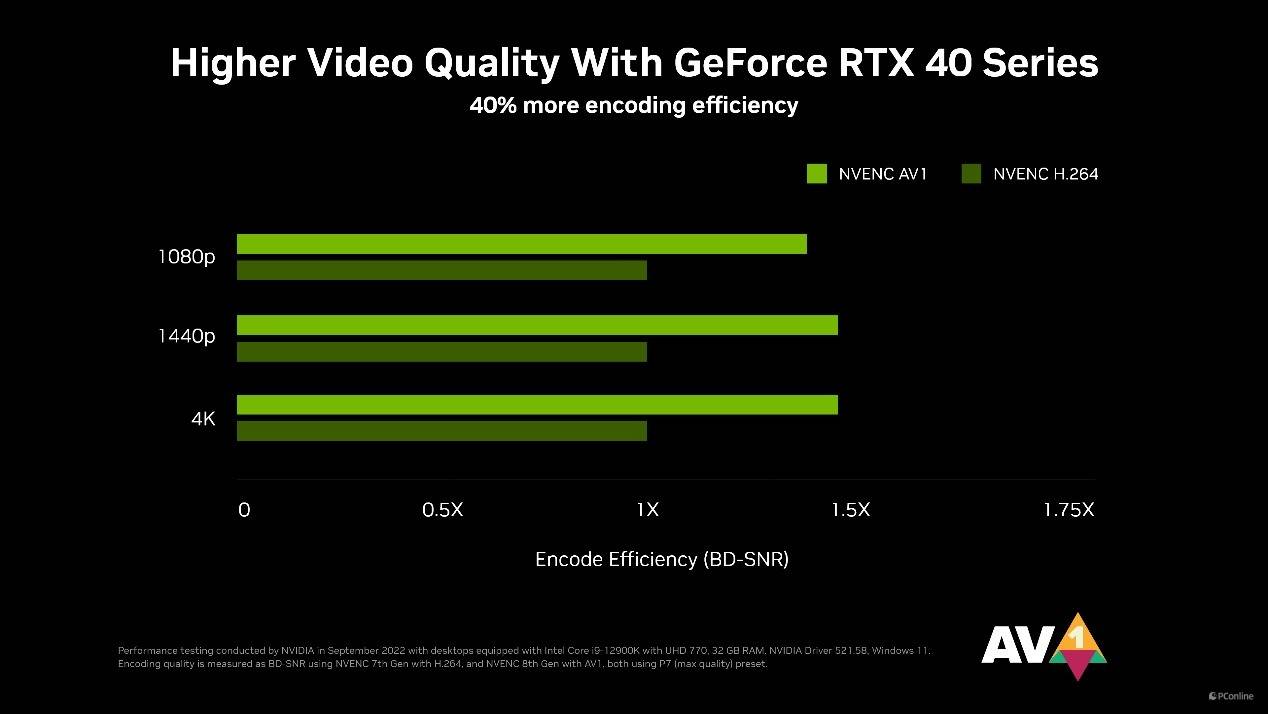 支持AV1编解码是RTX 40系显卡的又一优势。作为下一代主流的视频编码技术,AV1有着自己独特的优势,更快的编码速度和更高质量的流媒体传输性能,越来越多的剪辑软件和视频网站都青睐于它,像我们熟悉的达芬奇、剪映、B站等已经支持AV1编解码,未来AV1将会成为一个新趋势。