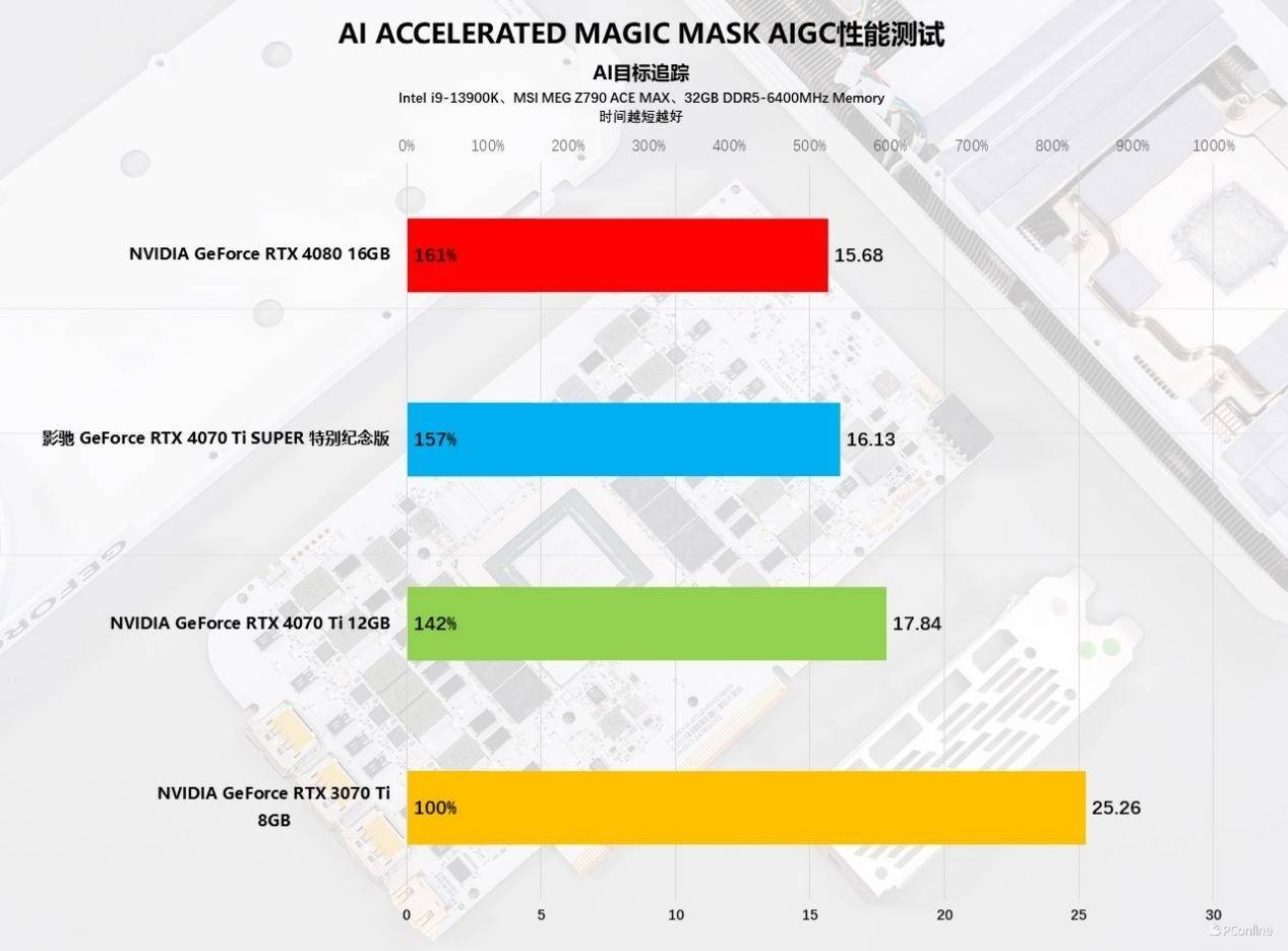 再来是基础的AI能力测试,使用达芬奇AI ACCELERATED MAGIC MASK测试时,可以看到影驰GeForce RTX 4070 Ti SUPER特别纪念版显卡的完成时间为16秒,而前代的RTX 3070 Ti则是25秒,并且单从效率上来看,也比RTX 4070 Ti快了15%左右。
