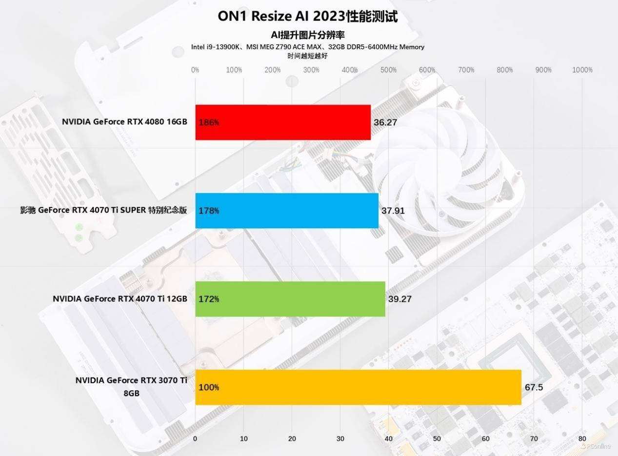 AI也经常被玩家用来放大图片,因此我们也是使用ON1 Resize AI 2023将5张图片提升200%分辨率,此时影驰GeForce RTX 4070 Ti SUPER特别纪念版显卡的速度为平均7.5秒一张,而上代的RTX 3070 Ti为13.5秒,超过70%的性能提升你就知道新的SUPER显卡有多厉害了。