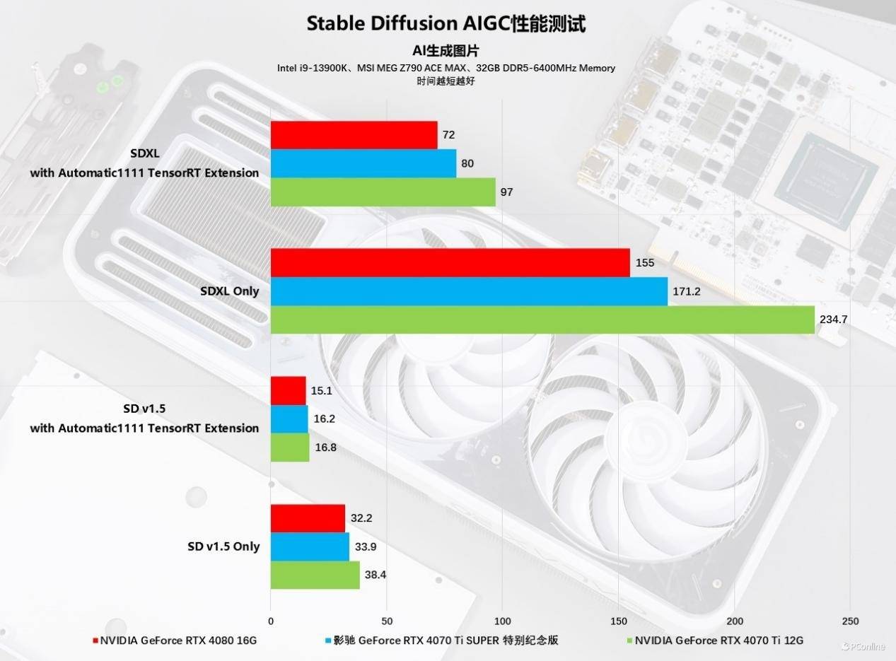 得益于NVIDIA多年来在AI领域的不断耕耘,其缔造的CUDA生态更是AI界不容小觑的力量。在这个以ChatGPT为首的AIGC大行其道的时代,想要用AI创作离不开显卡的加持。影驰GeForce RTX 4070 Ti SUPER特别纪念版显卡得益于更强的性能释放与大容量显存的加持,在AI上大有作为。从实测结果就知道,这张显卡的表现已经快追上RTX 4080了,对比RTX 4070 Ti就更强势了,硬件规格上的差距,让影驰GeForce RTX 4070 Ti SUPER特别纪念版显卡的效率更高,要是对比前代显卡那只能说是降维打击。对AI性能有一定要求,又想要性价比的玩家,影驰GeForce RTX 4070 Ti SUPER特别纪念版显卡应该是最合适的选择。