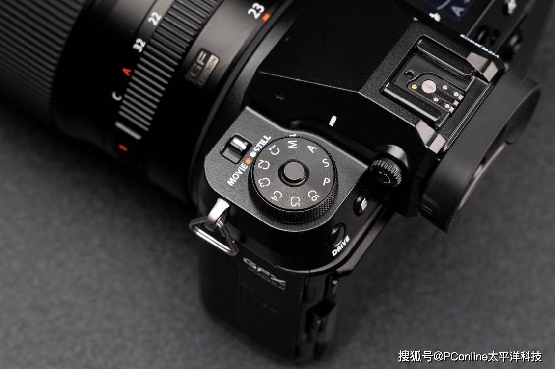 先来看看GFX100S II左肩,最直观的依然是适用于快速切换、具备锁止按键的“模式切换转盘”,除去基础的“P”“S”“A”“M”档位外,还有6档可自定义白平衡、颗粒、色彩关系的快捷“C”档位。对于人像摄影师、风光摄影师而言,这里可以存储一些你的“自定义专属胶片模拟”,以面对室外复杂多变的色彩光影关系。在“模式切换转盘”的上方还有一枚新的图片/视频切换拨杆,可以一键切换不同的拍摄需求(两种模式下,机内拍摄参数设置并不相同)。