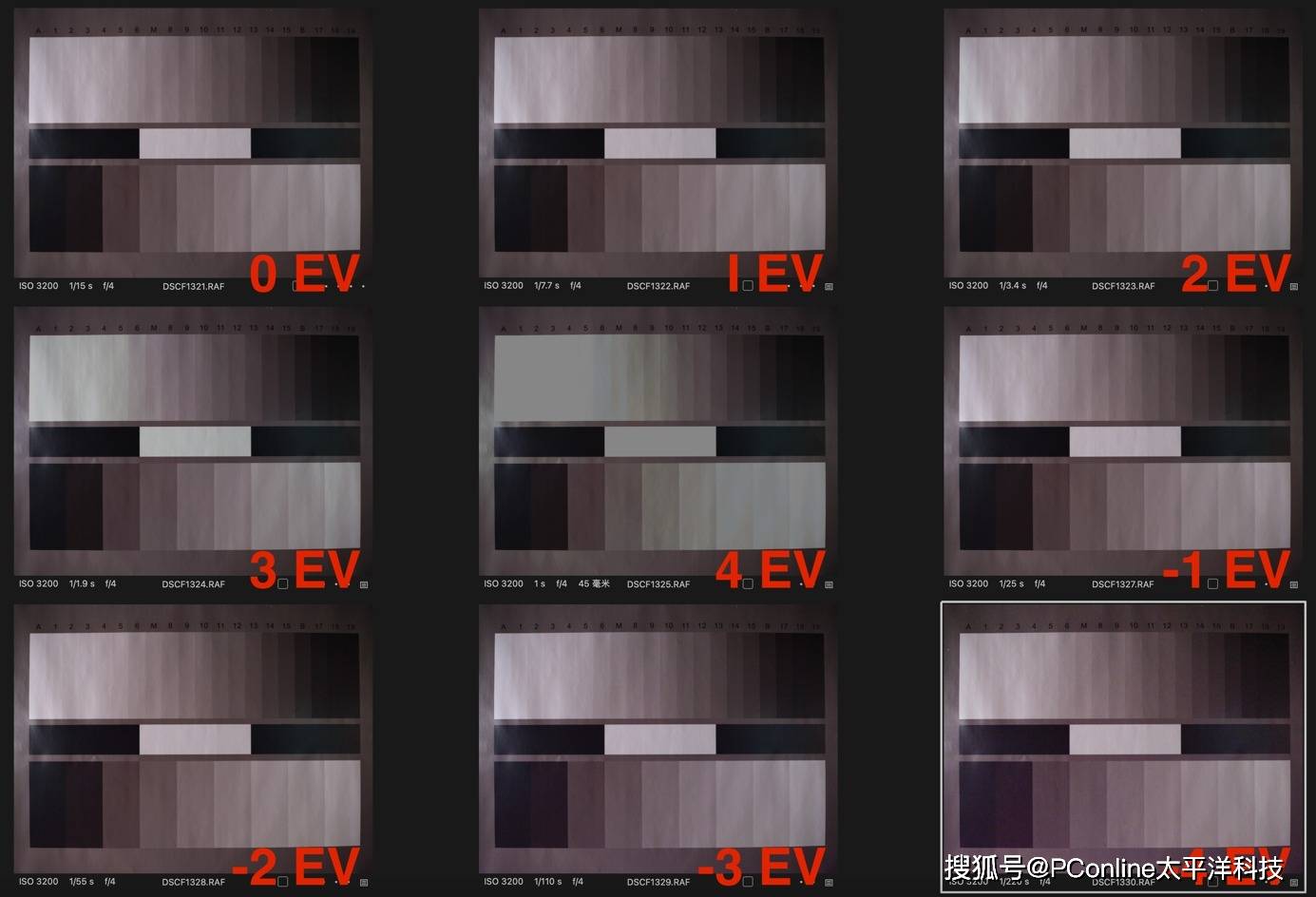 在标靶测试中,在ISO 3200时,富士GFX100S II在0+3 EV的过曝测试时,曝光修复后有着很优秀的宽容度表现,几乎不会有任何图片细节丢失;过曝4 EV时,亮部细节开始大幅丢失。反观欠曝表现,富士GFX100S II的表现令人折服,哪怕欠曝-4 EV,曝光修复后,几乎没有任何细节丧失,仅表现出暗部噪点问题。在置景拍摄测试中,在ISO 800时,基本与标靶ISO3200测试一致.