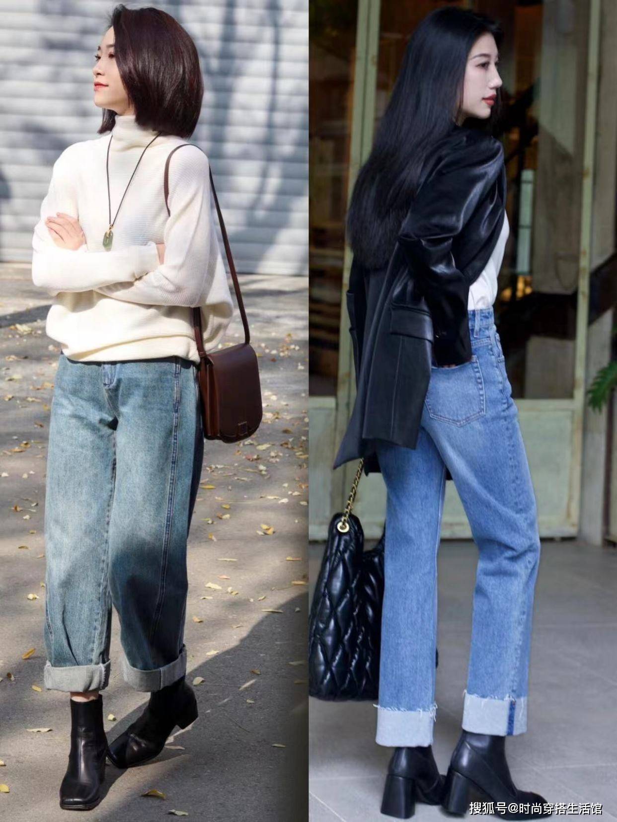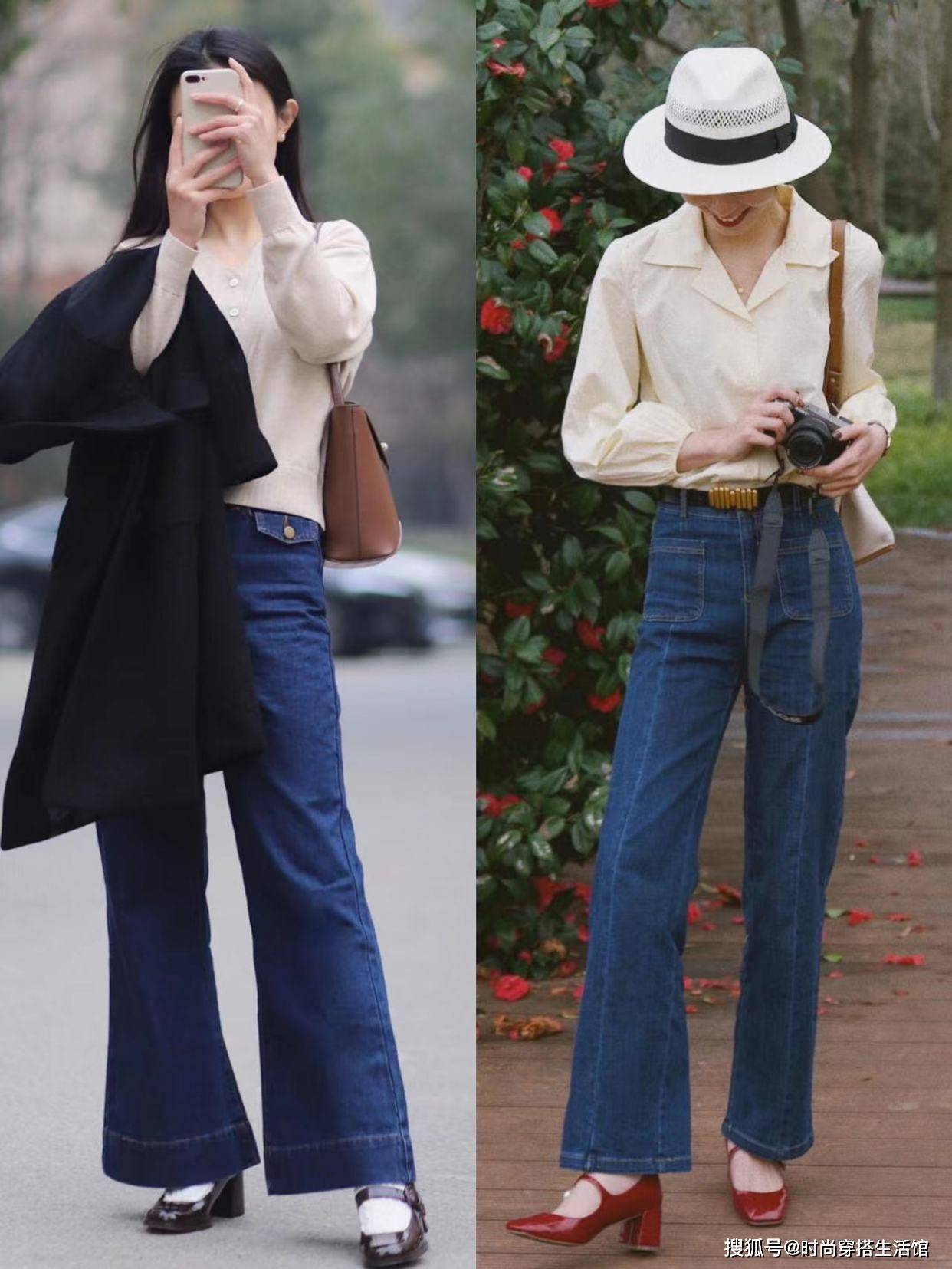 - 街拍:牛仔裤好看又百搭,搭配一字肩上衣很经典,百搭时尚