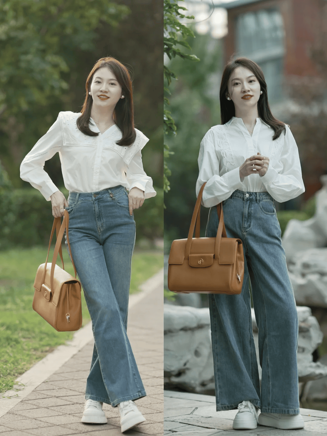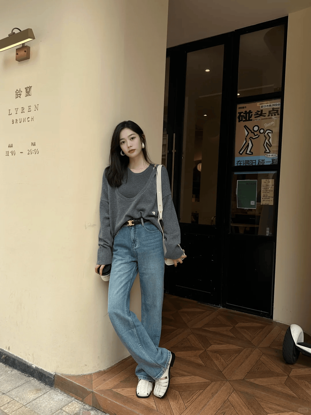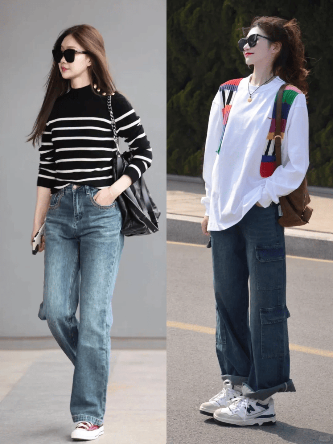 - 街拍:牛仔裤好看又百搭,搭配一字肩上衣很经典,百搭时尚