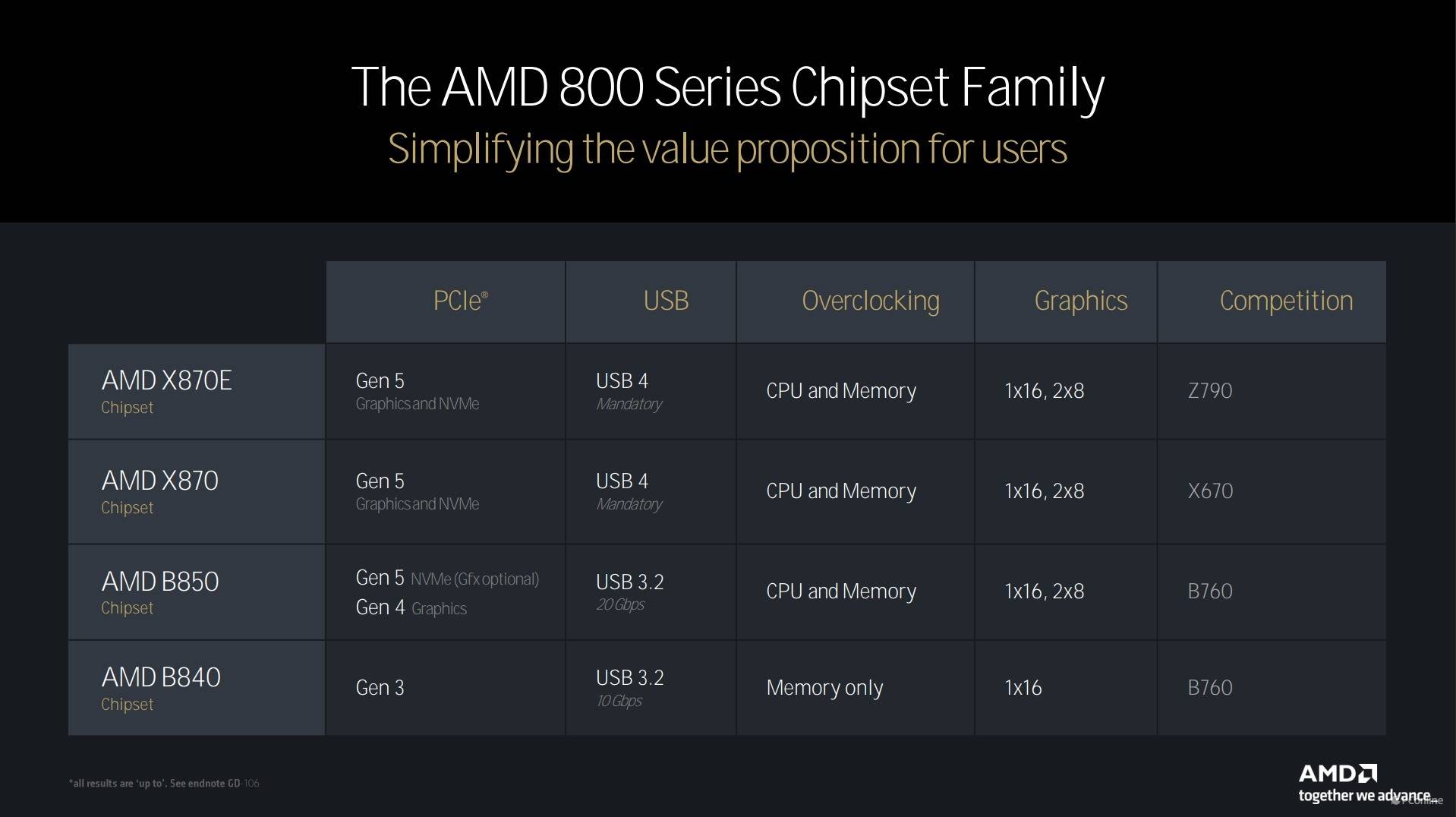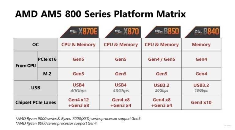 另外整个AMD 800系芯片组一共会有四款,分别是最顶级的X870E,X870以及定位主流的B850及全新的B840。不过最后这个B840更像上代的A620,其不支持超频,仅支持超频,并且南桥芯片不提供PCIe 4.0,仅有8条PCIe 3.0,而且CPU提供的PCIe通道也只有4.0,没有USB 4接口。