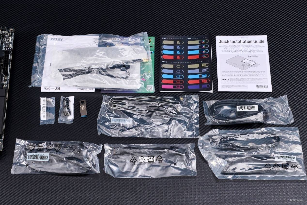 拆开包装后,内部的配件也是应有尽有,包括:快速安装手册、Eur环保说明书、产品注册手册、微星贴纸、驱动U盘、M.2安装螺丝、内六角拆装锁匙、两条SATA线、前置面板IO延长线、EZConn转换线、ARGB转换线,以及+12V RGB一分二线材等。