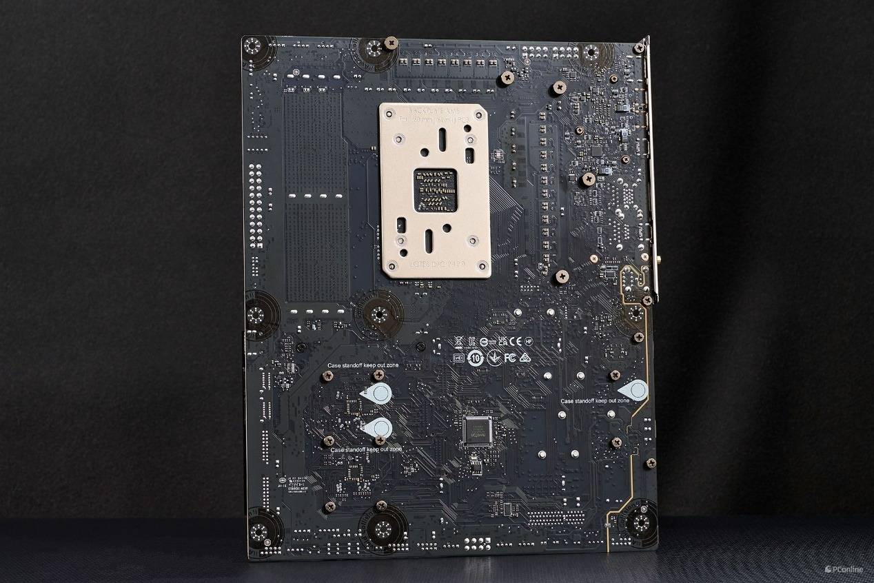 背面的元器件也相当丰富,可能是因为这款主板堆料太满,甚至平时在正面的I/O监控芯片也被安排到了背面。
