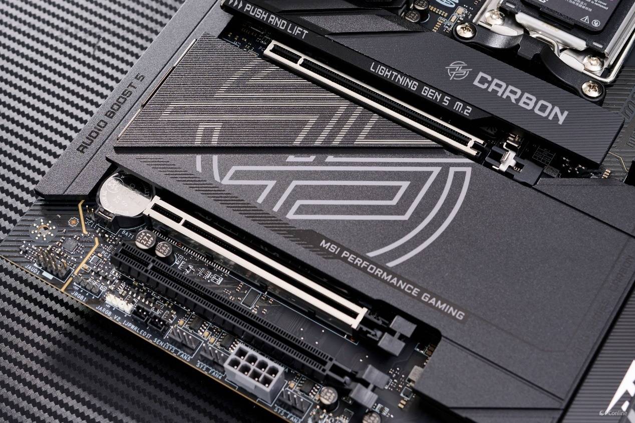 微星MSI MPG X870E CARBON WIFI暗黑主板提供了三条PCIe插槽,其中PCI_E1为处理器提供的PCIe 5.0×16插槽,而PCI_E2其实是物理上的PCIe 5.0×4插槽,最后的PCI_E3则是PCH提供的PCIe 4.0×1插槽。