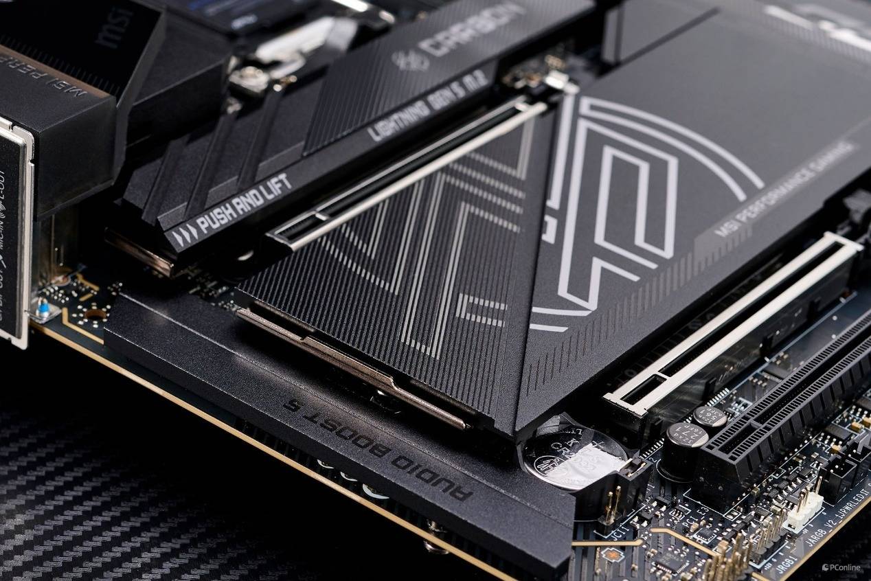 当然,高速率的存储速度也带来了更高的热量,因此微星也给这款主板安排了厚实的冰霜铠甲,并且这个装甲也改为免螺丝设计,并且不像上一代主板只有顶部一个插槽有,这次是全覆盖!