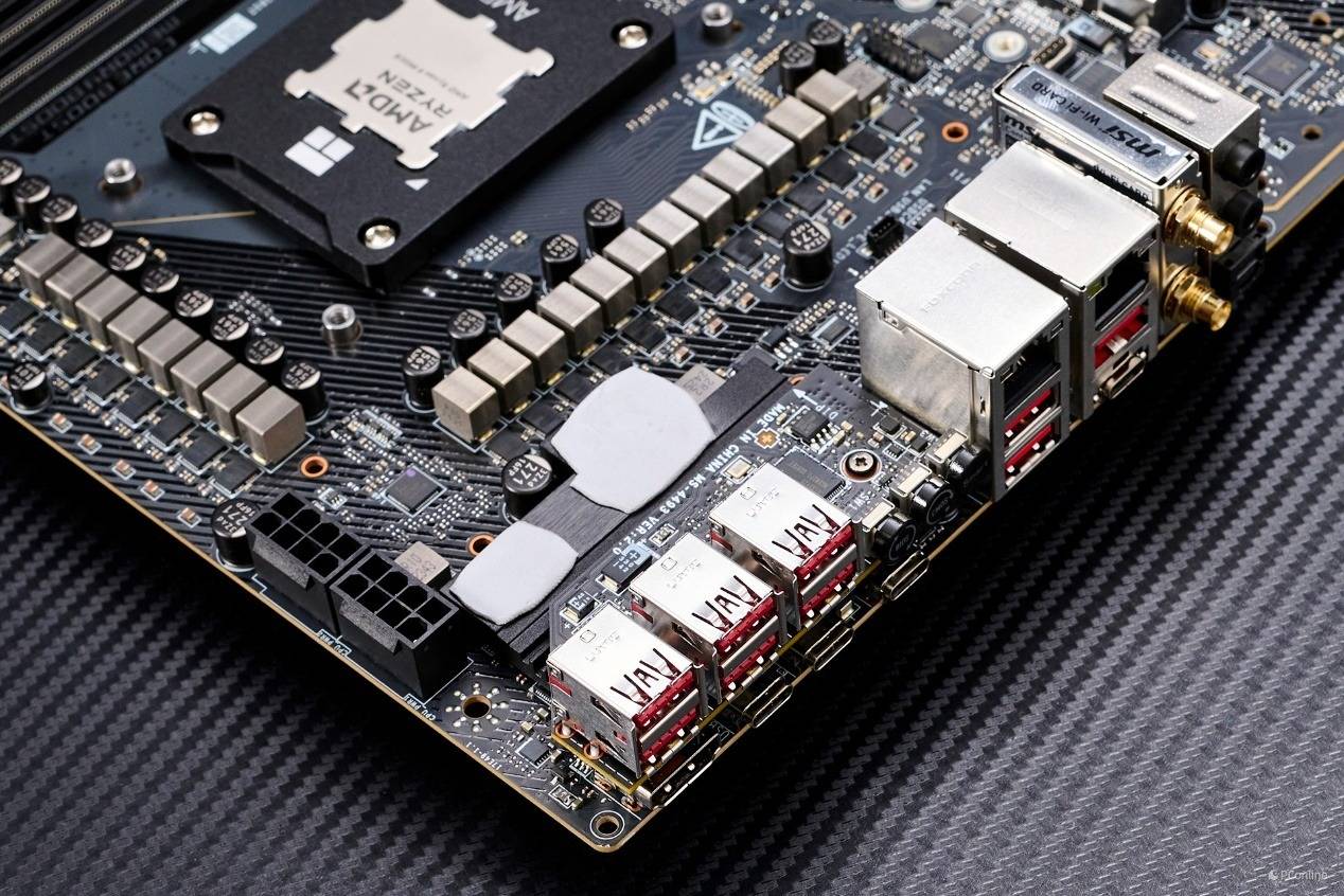 接口的升级才是本次的重点,清一色USB 3.2 Gen 2×1接口取代了原有的USB 2.0,超高传输速率的USB4接口一次就给到2个。除此之外,GPU和M.2插槽都支持PCIe 5.0,甚至于微星还给这款主板安排了PCIe额外的8Pin供电,战未来属性拉满。同时,还有WIFI 7以及5G+2.5G双网口配备,用料十足。