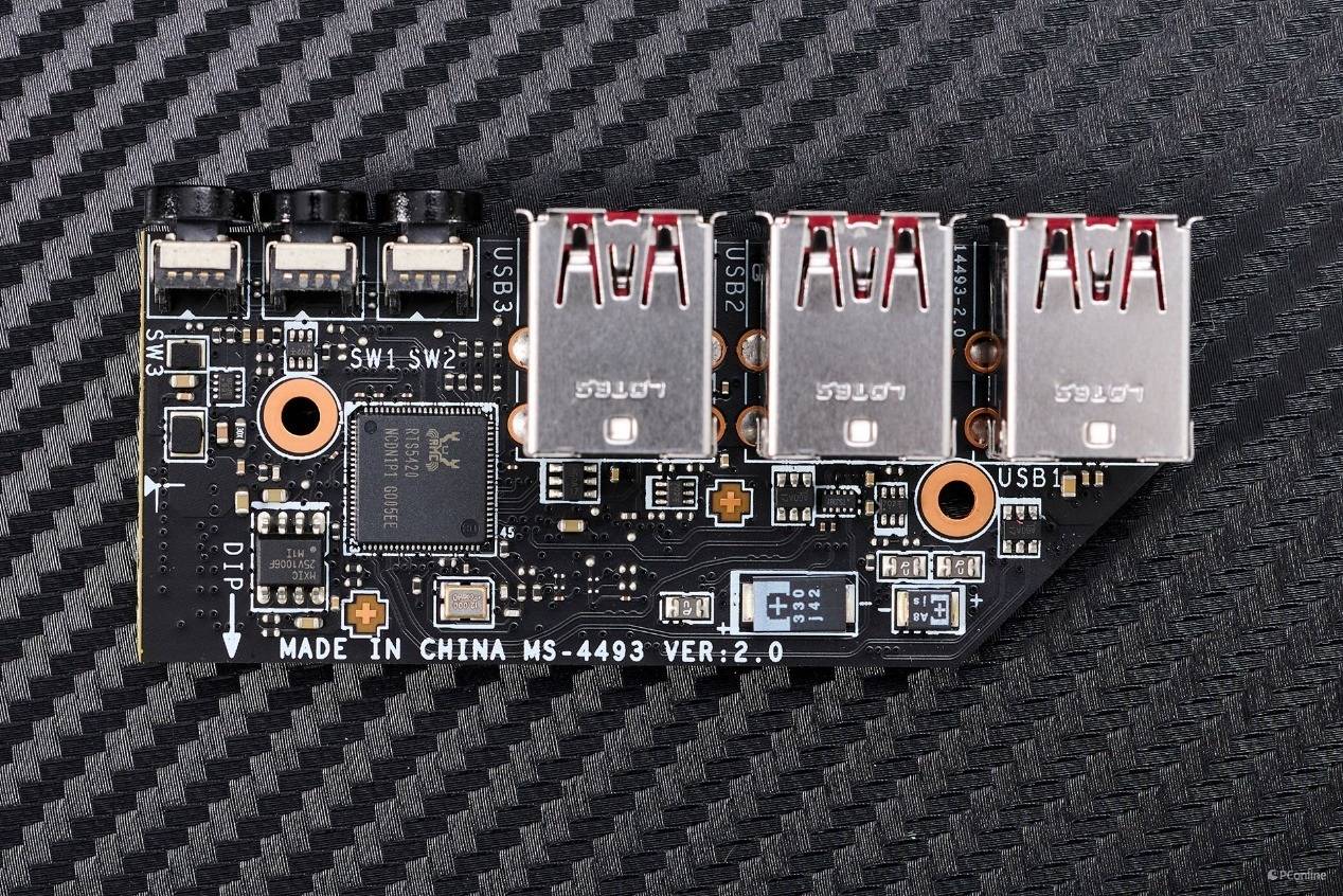 上层PCB主要用于扩展是USB 3.2 Gen 2×1接口,也就是我们刚刚说的USB-A 10Gbps接口,其中6个都由这款小小的瑞昱RTS5420芯片扩展。