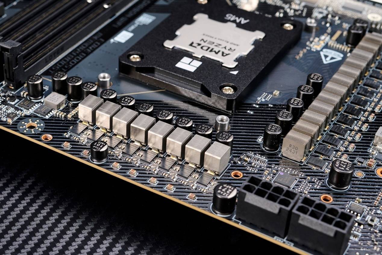 卸掉外表的散热马甲以后,主板的供电模组一目了然,微星MSI MPG X870E CARBON WIFI暗黑主板采用的是18+2+1相智能供电设计。