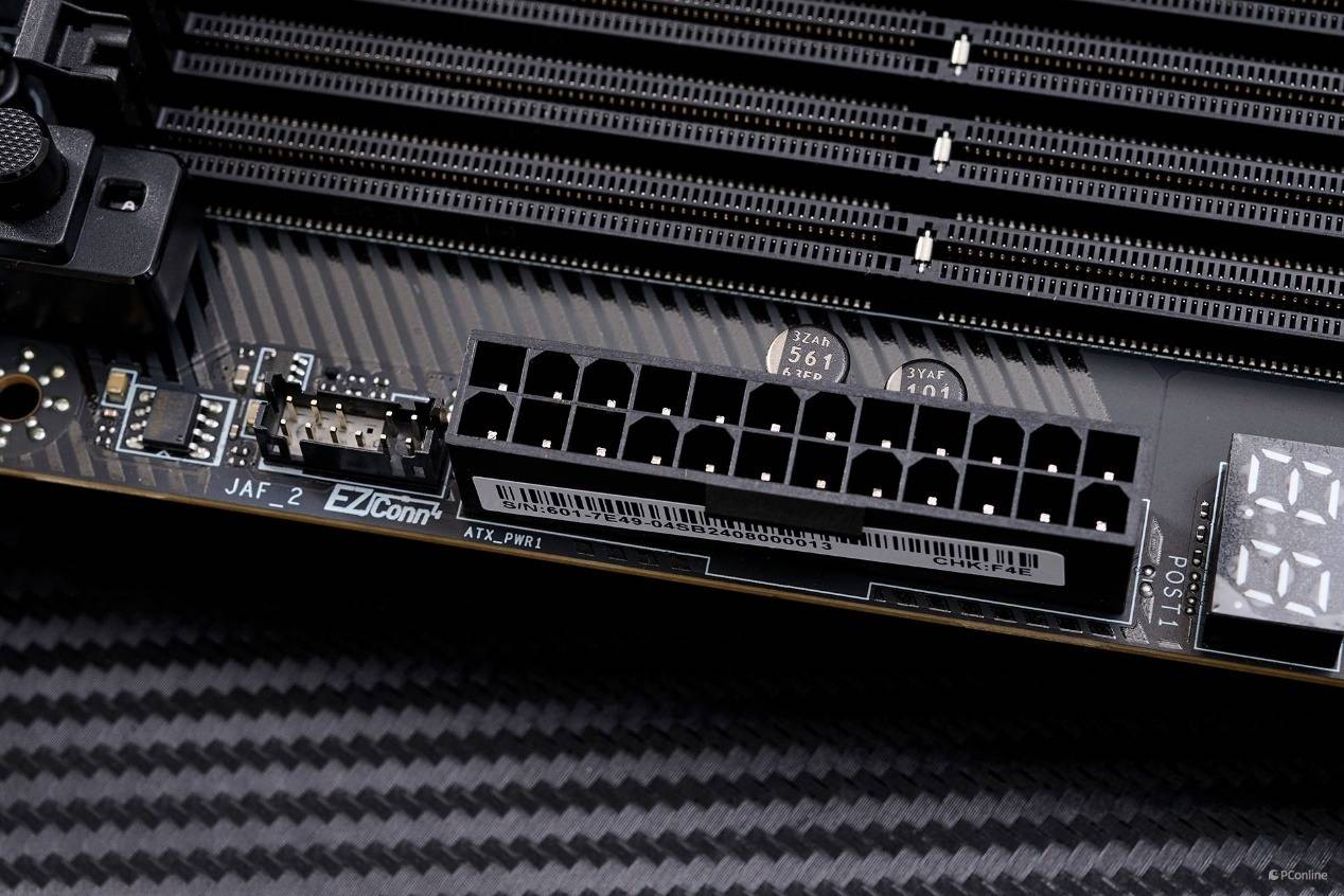 主板供电部分,CPU的供电接口为双Pin,主板的右侧依旧是24Pin供电接口,是硬件能够稳定运转的重要保障之一。