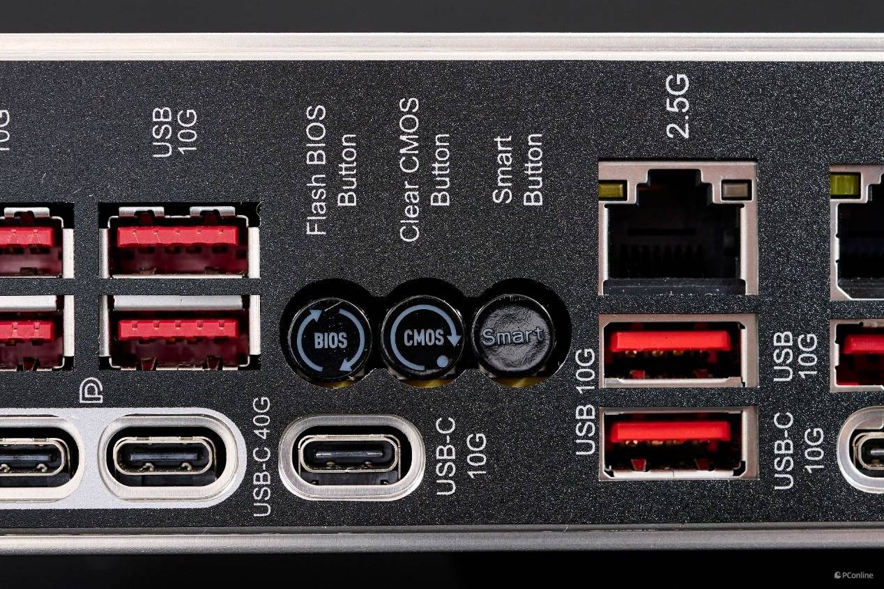 再看看后置I/O接口部分,微星给这款主板塞得满满当当的。提供的9个USB-A接口全部都是10Gbps速率,这一点值得夸赞!4个Type-C接口也进行了升级,最顶级的要属其中2个40Gbps的USB4接口了,不仅传输速率拉满,还能用于视频显示输出。剩下的两个Type-C也给到了10Gbps的USB 3.2 Gen 2。剩下还有1个HDMI 2.1视频输出口,2个RJ45网口(5Gbps+2.5Gbps)、WiFi 7天线接口以及音频接口。