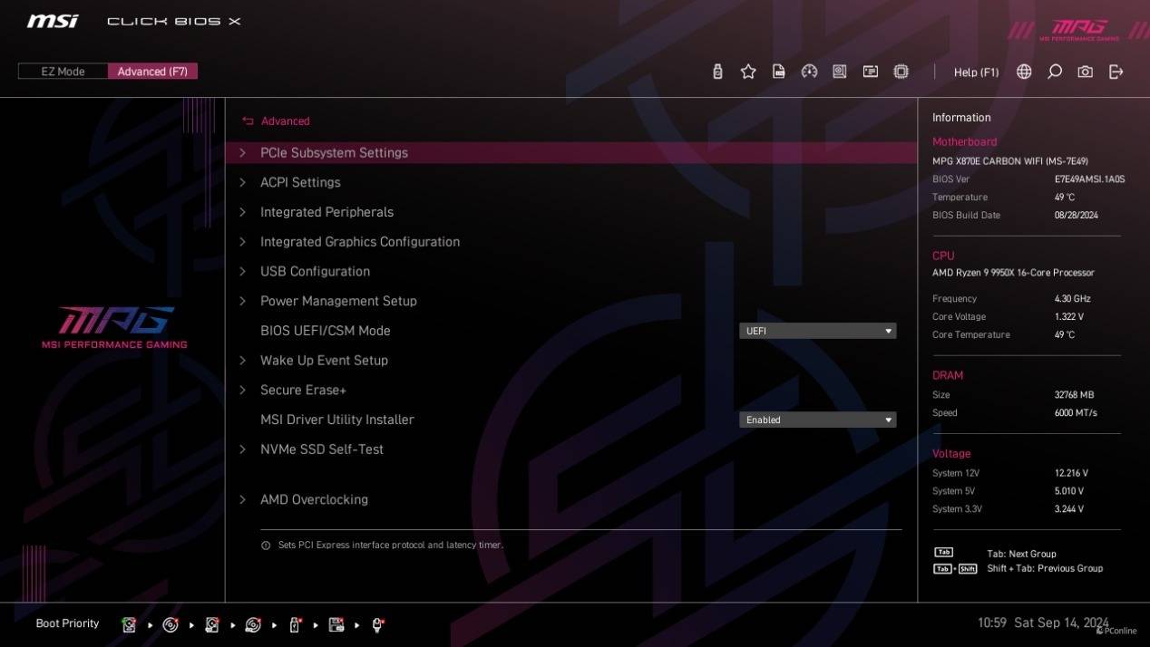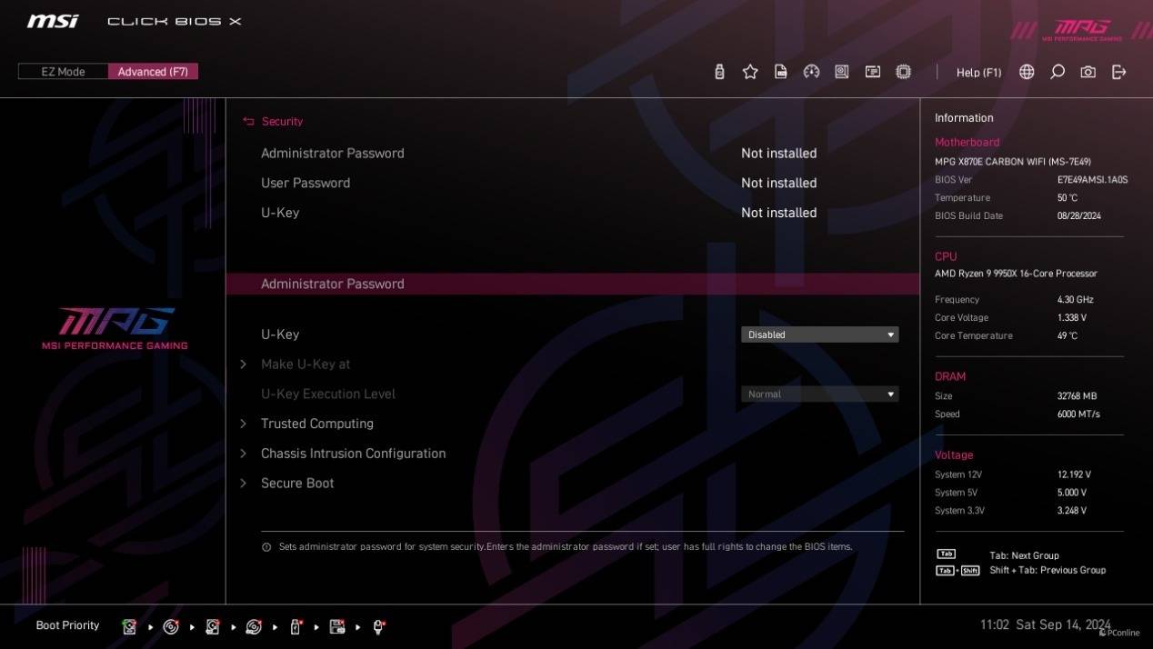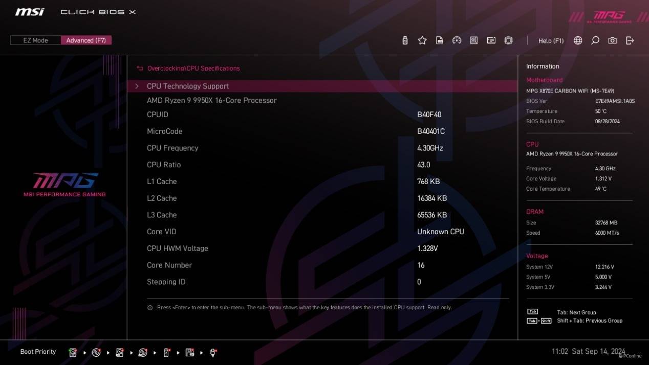 除了外部硬件升级,微星也给AMD 800系主板的BIOS来了一次大更新!全新的BIOS界面用上了更新潮的UI界面,并且据微星的说法,不同系列会有专属的BIOS设计,例如我们手上的微星MSI MPG X870E CARBON WIFI暗黑主板的BIOS界面里就有独属“MPG”的Logo。