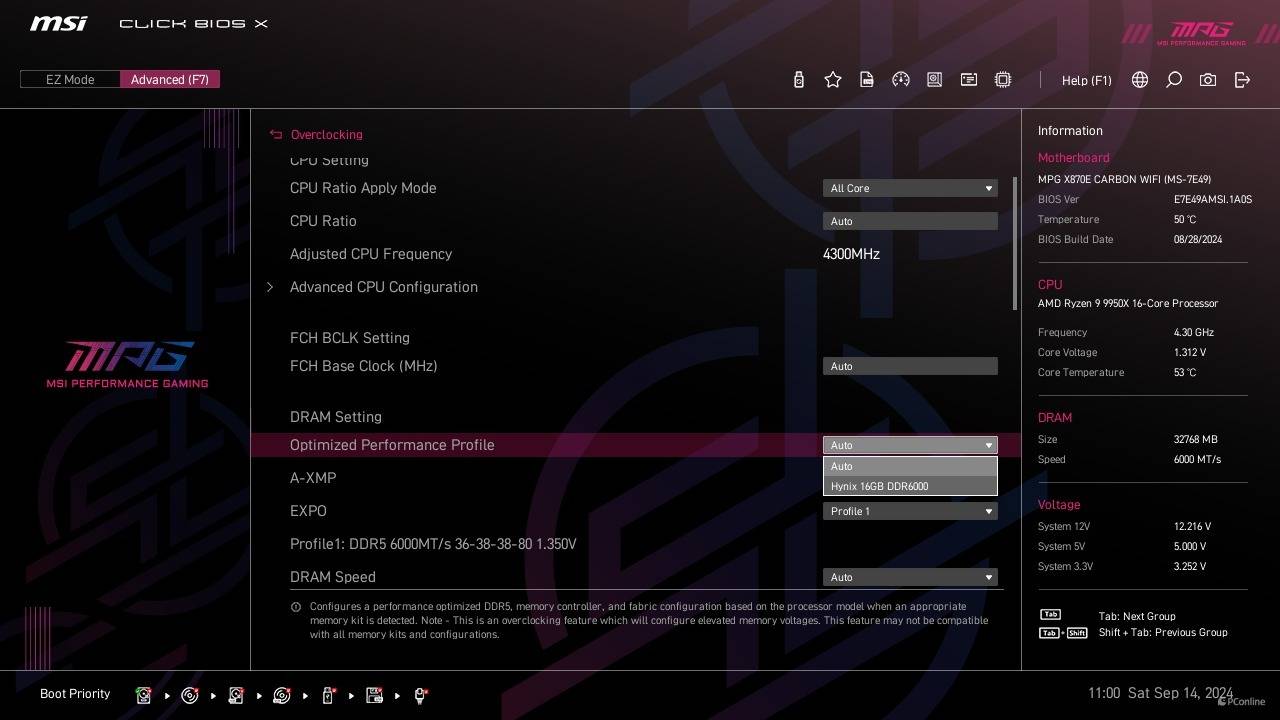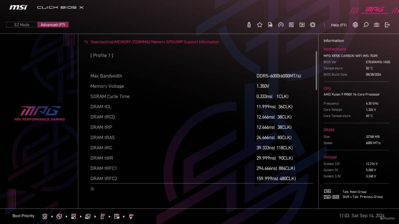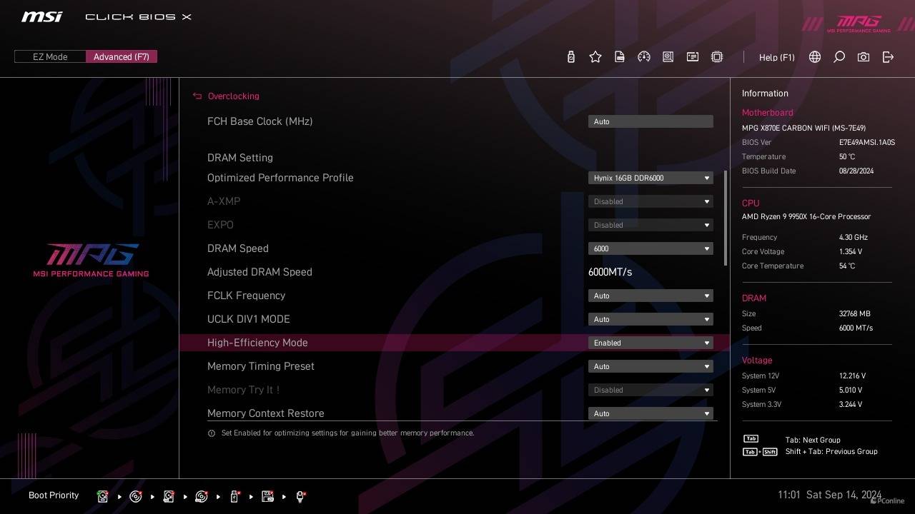 除了AMD OPP功能外,微星MPG X870E CARBON WIFI暗黑主板还引入了内存高性能模式High Efficiency mode,说是对SK海力士A-die颗粒的专属优化,实际上就是对内存小参动手了,通过优化这些小参让内存达到更高的传输速度以及更低的延迟。High Efficiency mode模式提供四档选择,从高到低分别是Tightest, Tighter, Balance和Relax。